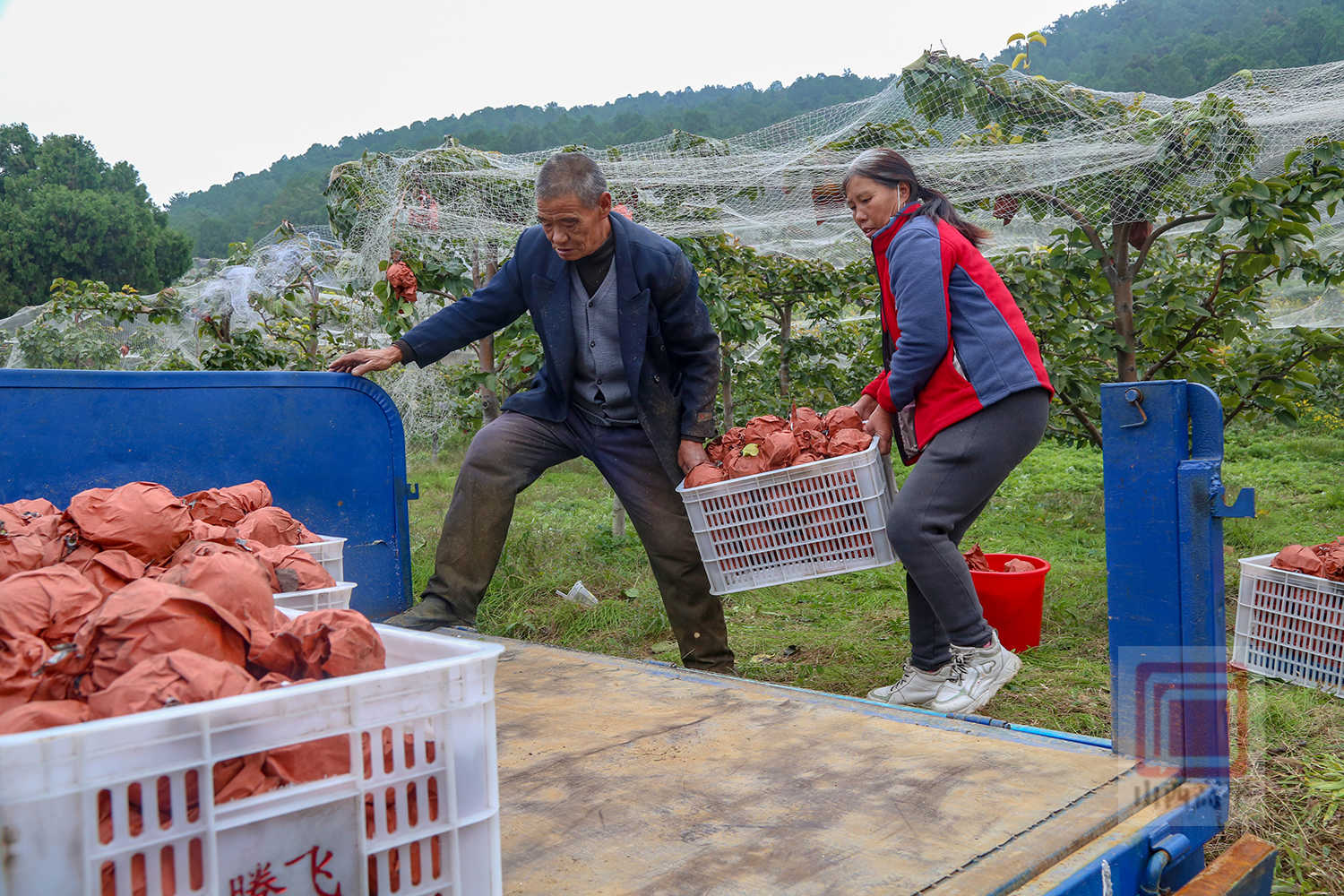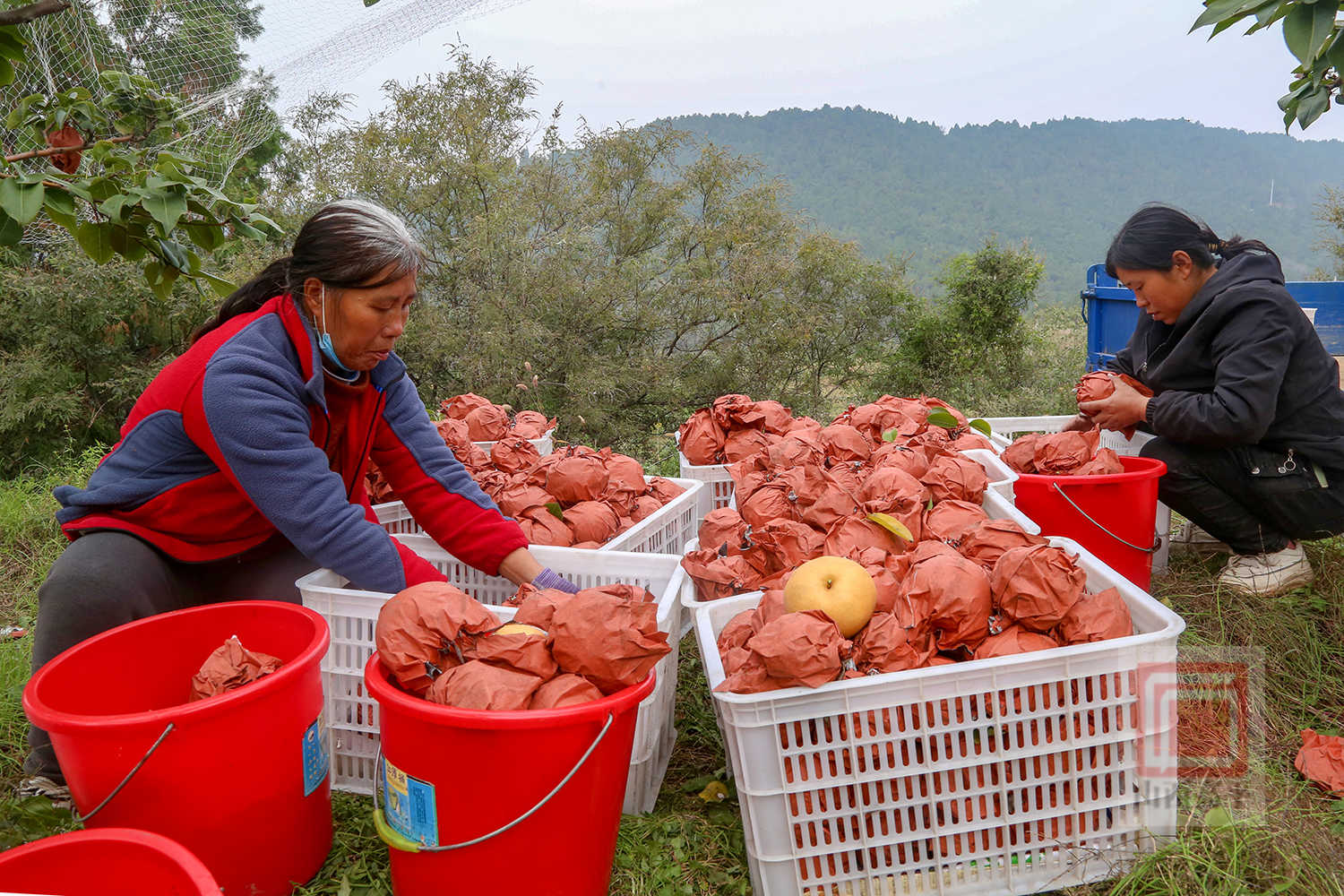 走进采摘园,果香阵阵,个头匀实、色泽泛红的晚秋黄梨缀满枝头。村民们手提小桶穿梭于梨树间,动作娴熟地采摘、装筐,脸上洋溢着丰收的喜悦。