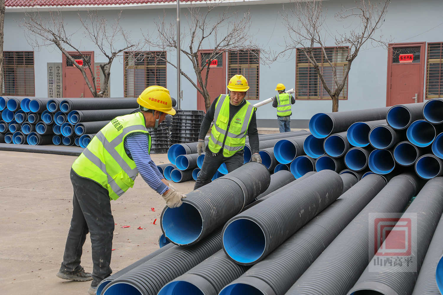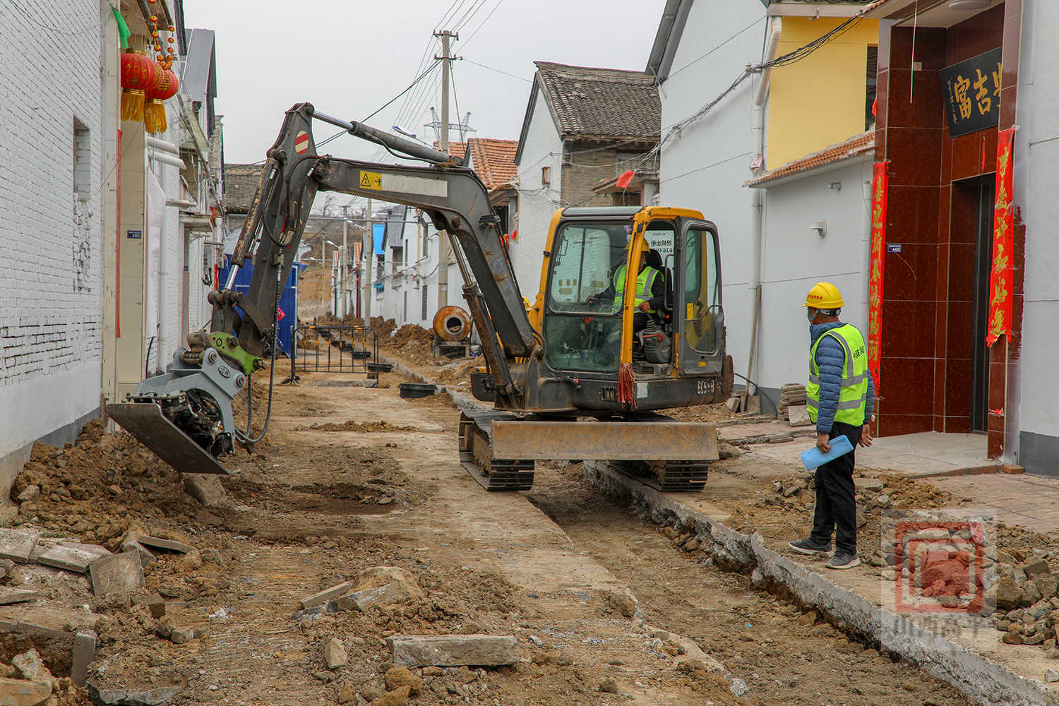 来到野川镇柳树底村项目施工现场,机械轰鸣作响,施工人员分布在各个作业点位,有条不紊地开展沟槽开挖、管道铺设、材料搬运等作业,现场一派如火如荼的繁忙景象。