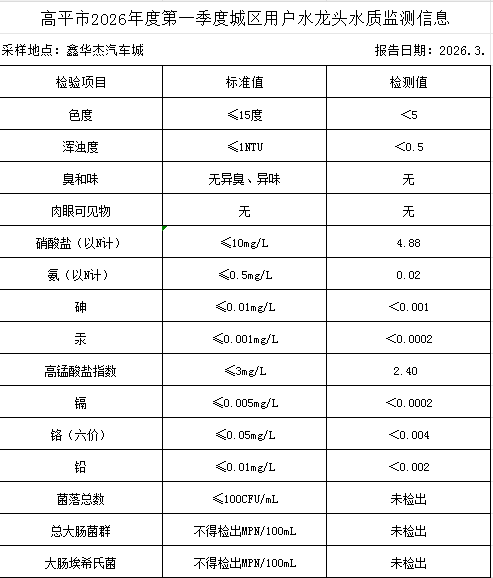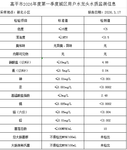 为有效防控因饮用水卫生问题导致的健康风险,切实保障群众饮水安全,根据省市县有关规定,要定期对我市城区用户水龙头水质进行监测。现将2026年度第一季度市区5个监测点的数据予以公示,请社会各界予以监督。监督电话:0356—3232131。