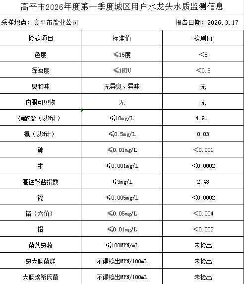 高平市2026年度第一季度城区用户水龙头水质监测信息