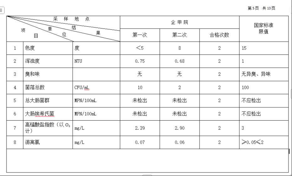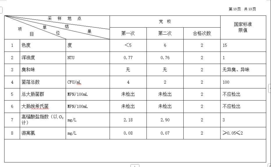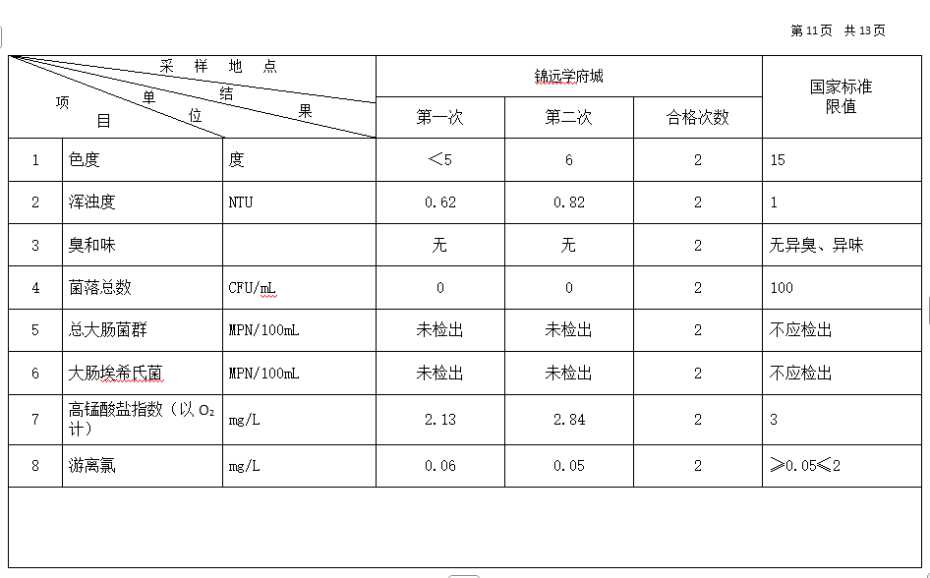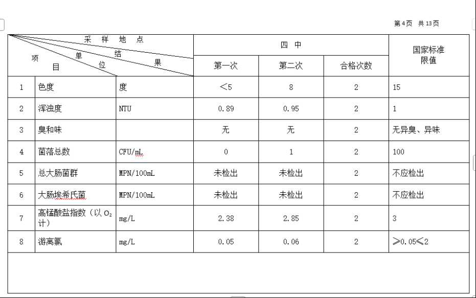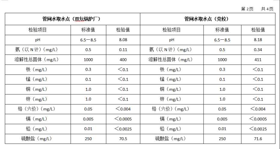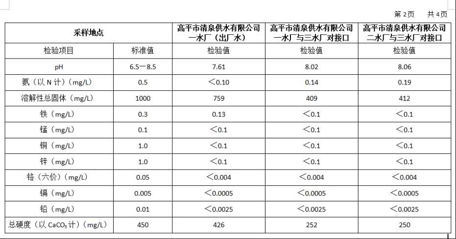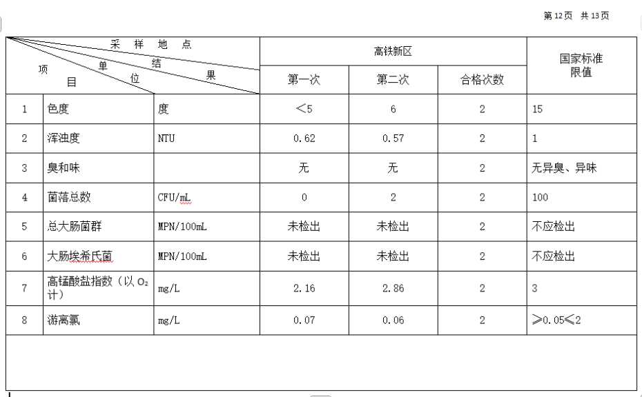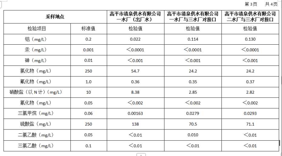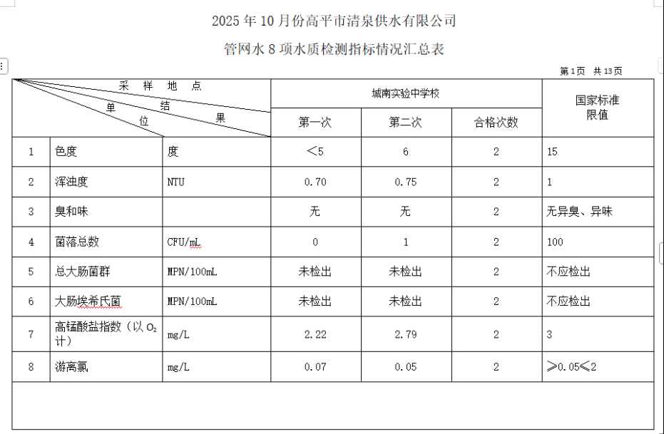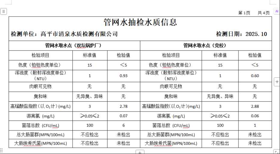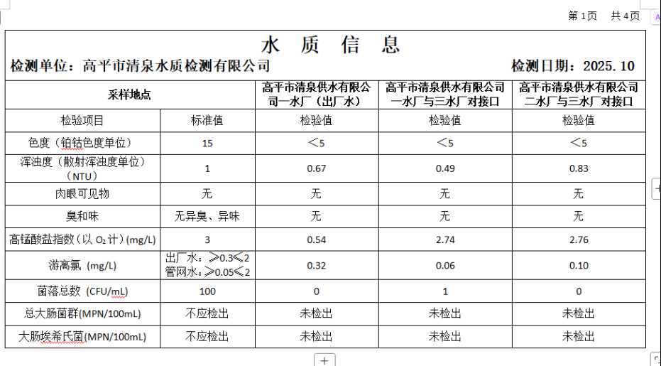 高平市清泉供水有限公司2025年10月份城市集中供水水质信息 来源: 发布时间:2025-11-10 【字体:小 大】 如果内容不能正常显示,请更换浏览器进行重试 附件:2025年10月份高平市清泉供水有限公司水质、管网水质信息.doc 附件:2025年10月份高平市清泉供水有限公司管网水8项水质检测指标情况汇总表.docx 本页二维码 【打印正文】