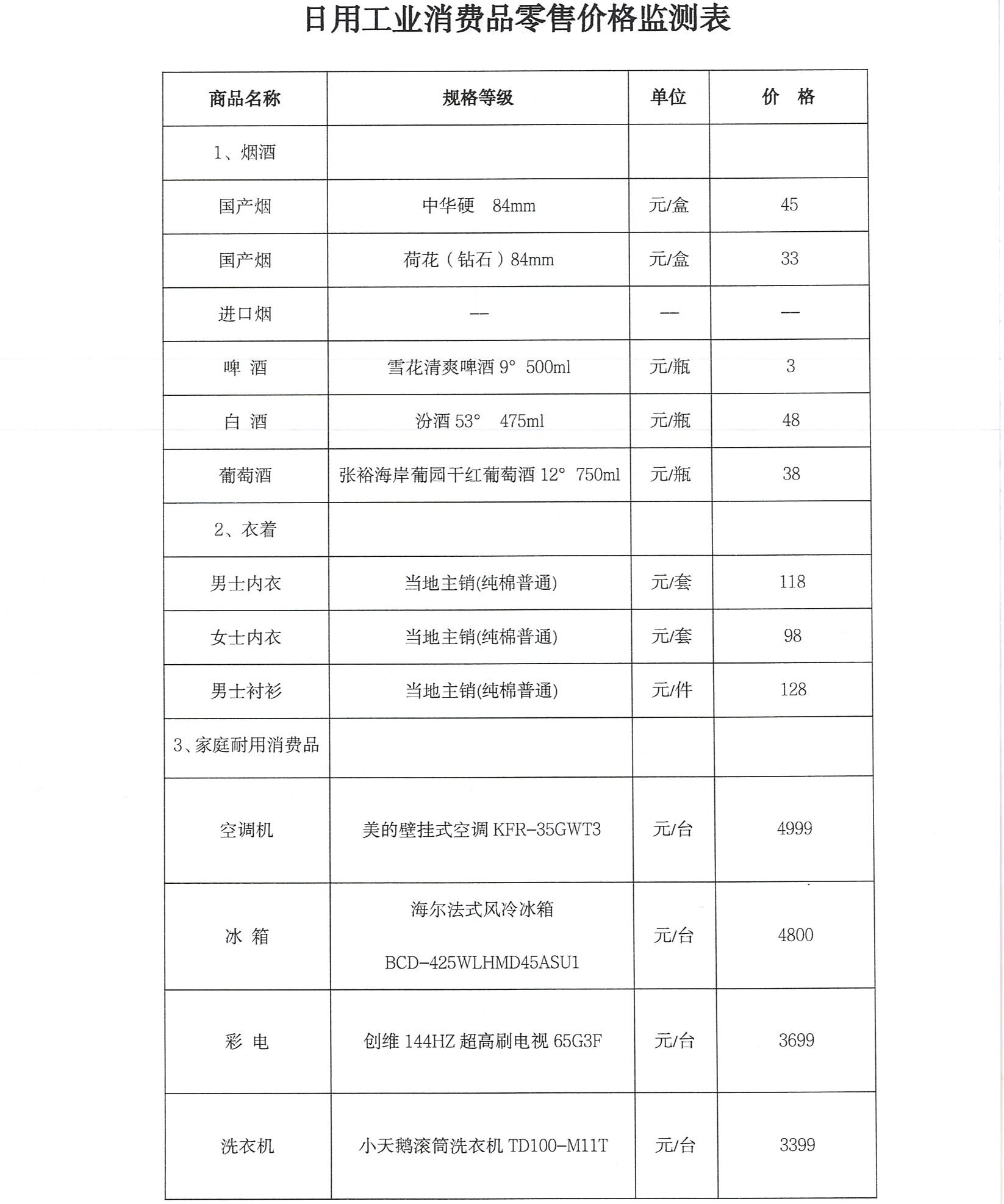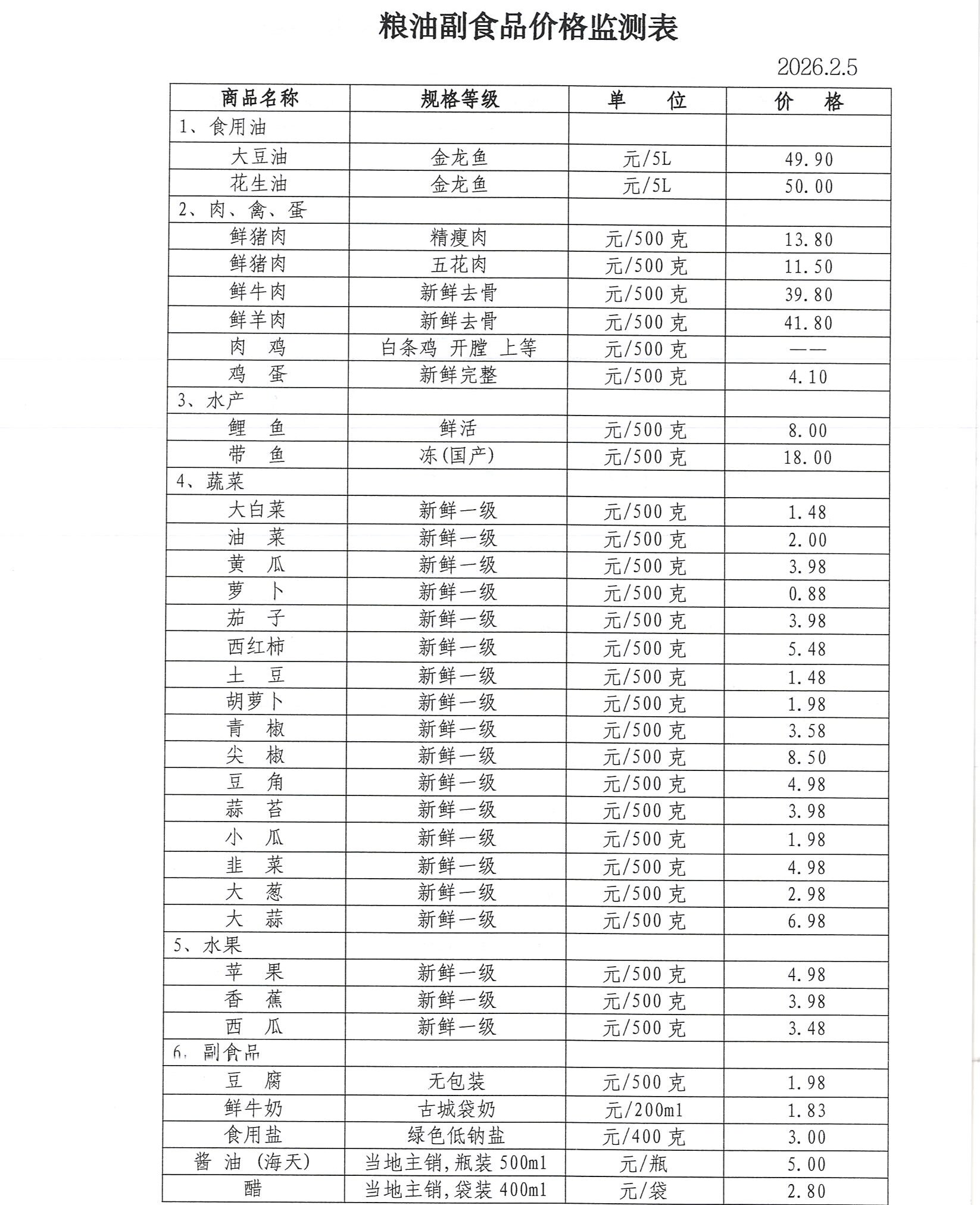 价格旬监测(2026.2.5) 来源: 发布时间:2026-02-09 【字体:小 大】 如果内容不能正常显示,请更换浏览器进行重试 附件:成品粮价格监测表.doc 附件:粮油副食品价格监测表.doc 附件:日用工业消费品零售价格监测表.doc 附件:生产资料价格监测表.doc 附件:原粮收购销售价格监测表.doc 本页二维码 【打印正文】
