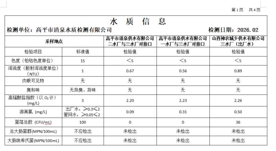 高平市清泉供水有限公司2026年2月份城市集中供水水质信息 来源: 发布时间:2026-03-10 【字体:小 大】 如果内容不能正常显示,请更换浏览器进行重试 附件:2026年2月份高平市清泉供水有限公司水质、管网水质信息.doc 附件:2026年2月份高平市清泉供水有限公司管网水8项水质检测指标情况汇总表.docx 本页二维码 【打印正文】
