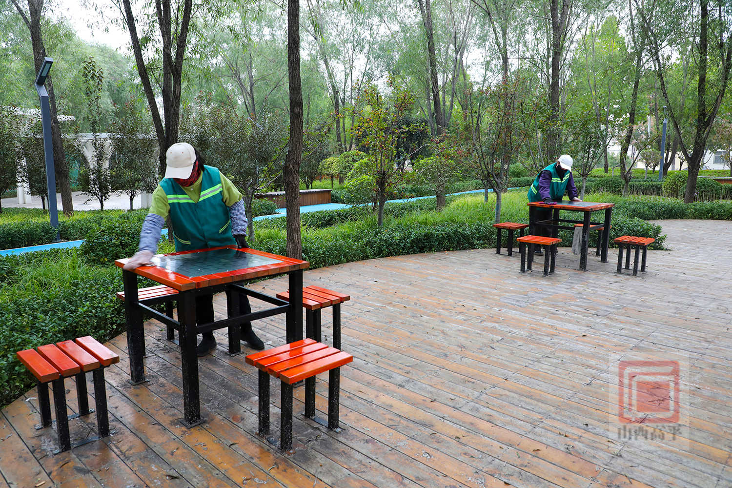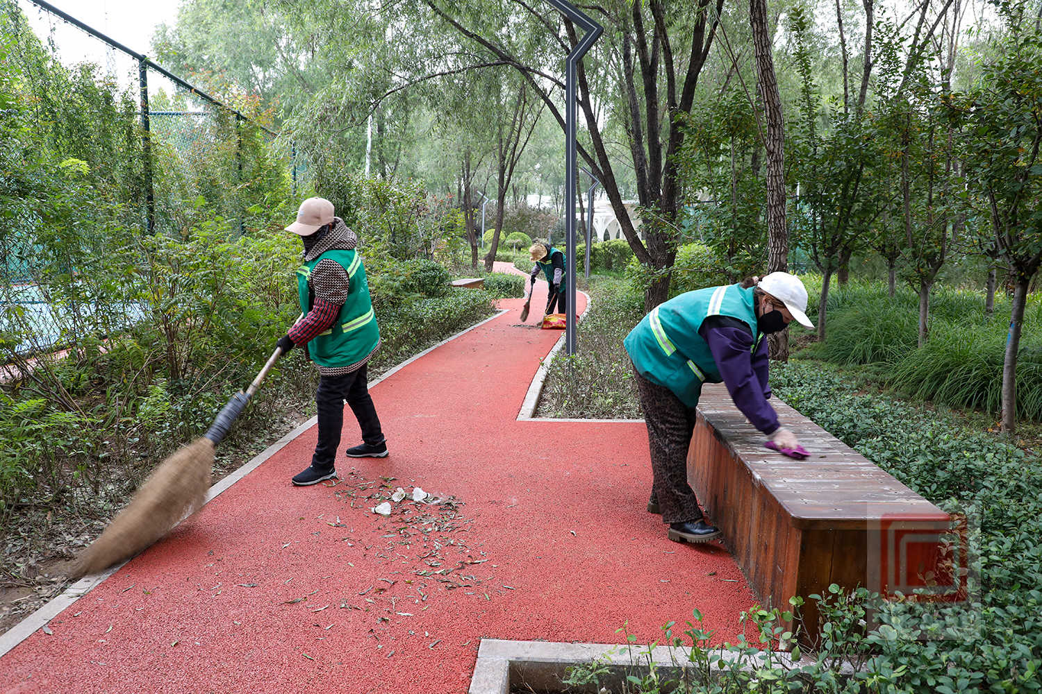 深秋时节,位于太行叔和康养中心旁的运动公园内,层林尽染,色彩斑斓,好一幅充满诗意的秋日画卷。园林工人各司其职,有的手持专业工具,正在对乔灌木进行修剪整形,有的则细致清理绿地落叶与杂物,在维护景观美观的同时,为市民营造一个整洁舒适的健身环境。