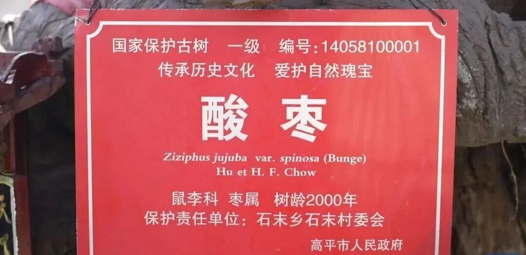 画面中的这棵古树,就是被誉为“山西酸枣王”的千年酸枣树,高11米,树围1.8米,需要三到四人才能合抱。据专家考证,它的树龄已有2000年,盛时冠如伞盖,冠长10余米,这在灌木科的植物中极为罕见。