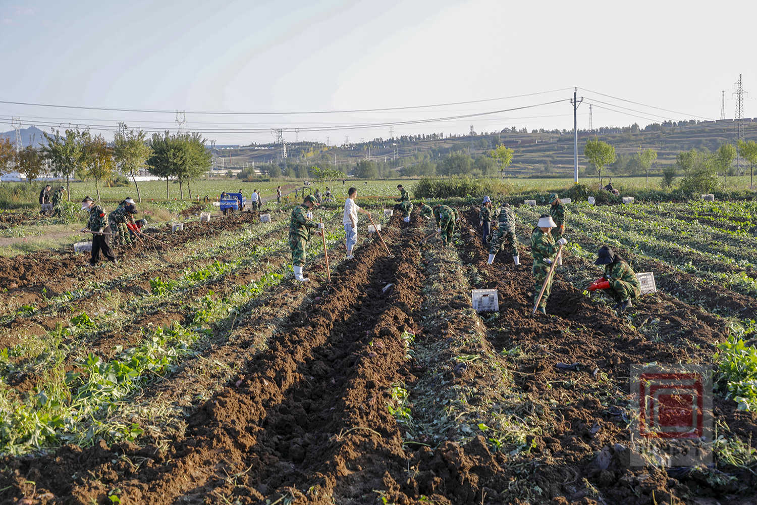 来到太行一号神农片区红薯种植基地,3台红薯收获机在田间来回穿梭作业,红薯抢收工作火热展开。伴随着收获机驶过湿软的土地,红薯从泥土中翻出。50多名工作人员分工协作,手持锄头翻刨土地、去泥、分拣、搬运红薯……整个抢收过程衔接有序,大家干劲十足。