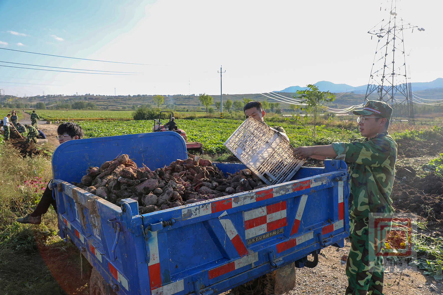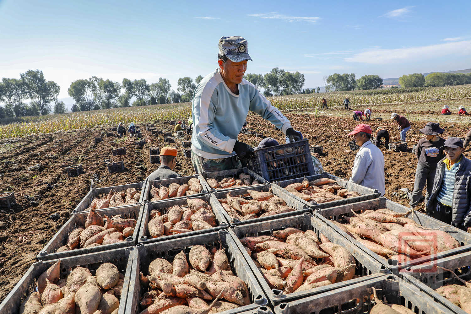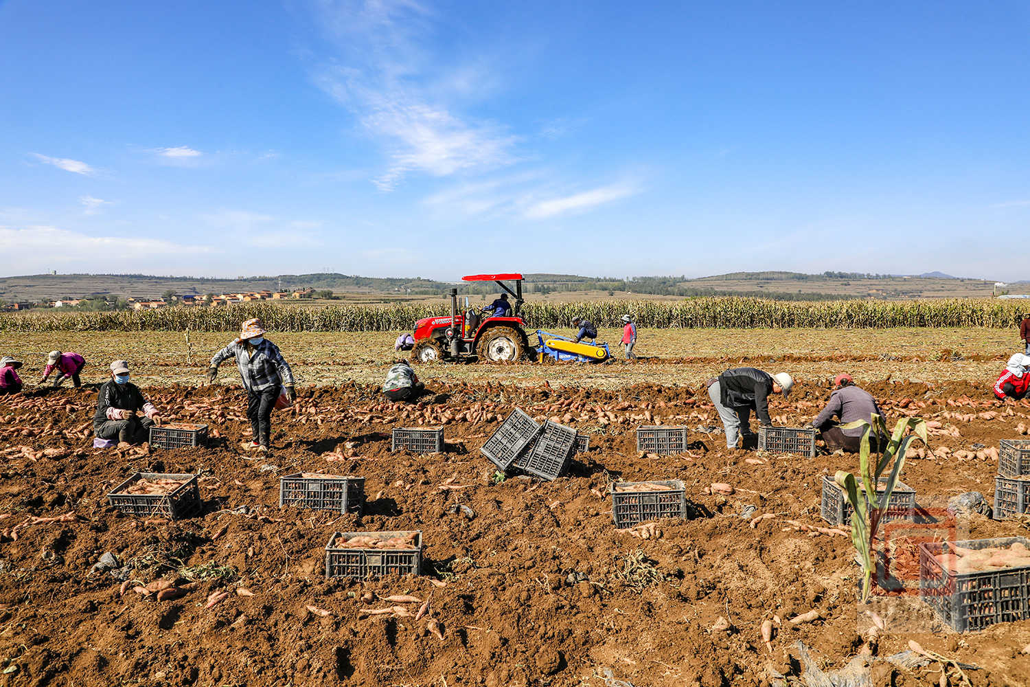 在石末乡寨平村的田间,也是一派抢收景象。宣武京种植专业合作社调配了1台红薯除秧机、1台红薯收获机,并组织70余名村民开展抢收作业。村民们紧跟在红薯收获机后面,随着红薯破土而出,大家翻捡、去泥、装筐、装车,动作麻利。两辆运输车往返运送,将一筐筐新鲜出土的红薯及时运往临时仓库进行晾干。