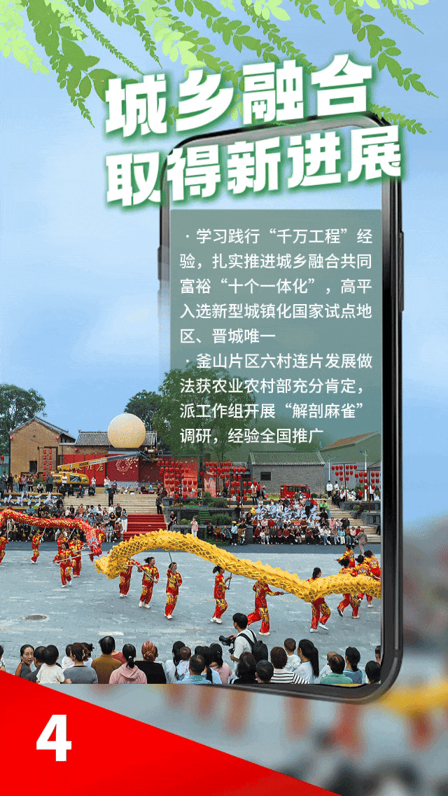 高平真学活用“千万工程”经验,先后打造了喜镇苏庄、福地釜山、乐火北庄、礼遇伯方、德行市望、古香中庙等特色乡村,一个个特色乡村随手一拍都是美景。城乡融合的步伐也同样扎实,张峰供水覆盖35万人,实现“同城同质同价”。集中供热覆盖率达到80%。供气实现“一县一企”“同城同价”。供排污一体化覆盖率达到69%。城乡环卫一体化覆盖率达到65%。卫生厕所普及率达到91%。城镇化率增长至57.90%、晋城第1(除城区),城乡居民收入比缩小至2.03。全市85%的村收入超50万元,58%的村收入超100万元。
