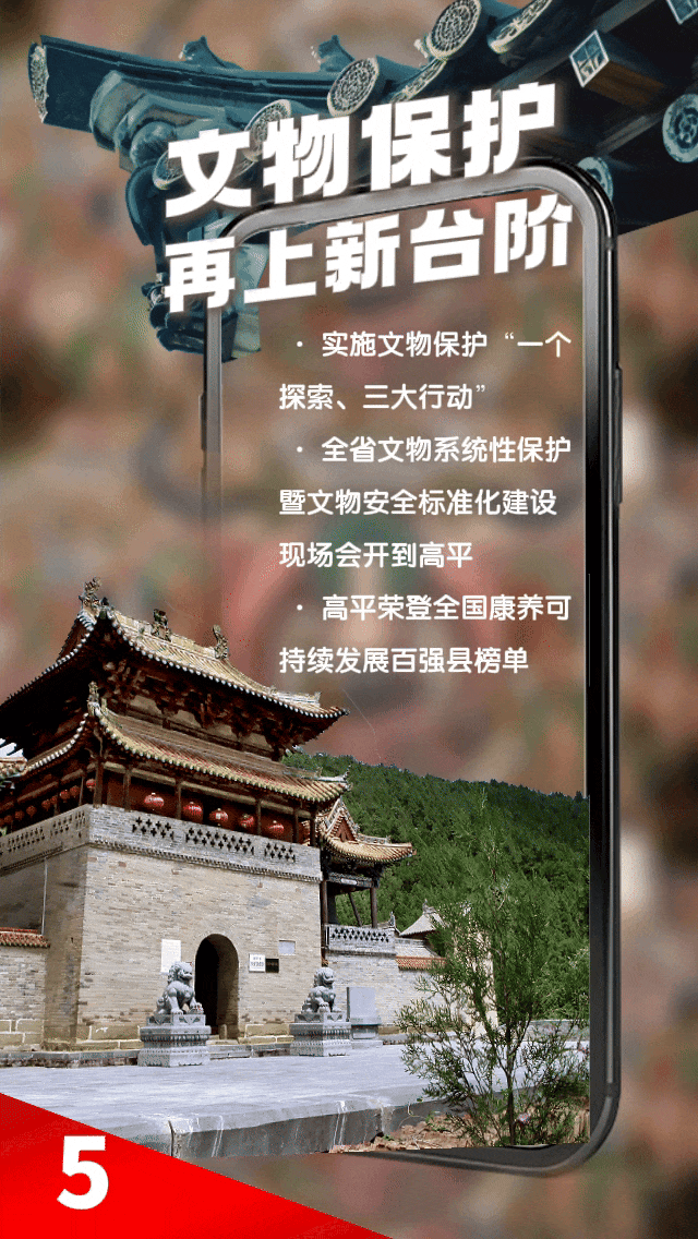 文物保护是我市的一项重要工作,建立完善了文物局、文物保护中心、5个文物保护所、6支队伍的“1+1+5+6”文物保护体系。推动文化遗产保护传承和文旅深度融合,釜山景区获评国家4A级旅游景区,长平之战纪念馆、古香中庙、礼遇伯方、山居许庄、乐火北庄获评国家3A级旅游景区,高平荣登全国康养可持续发展百强县榜单。文物“活”起来了,文旅“火”起来了,咱在家门口就能享受到康养美景。