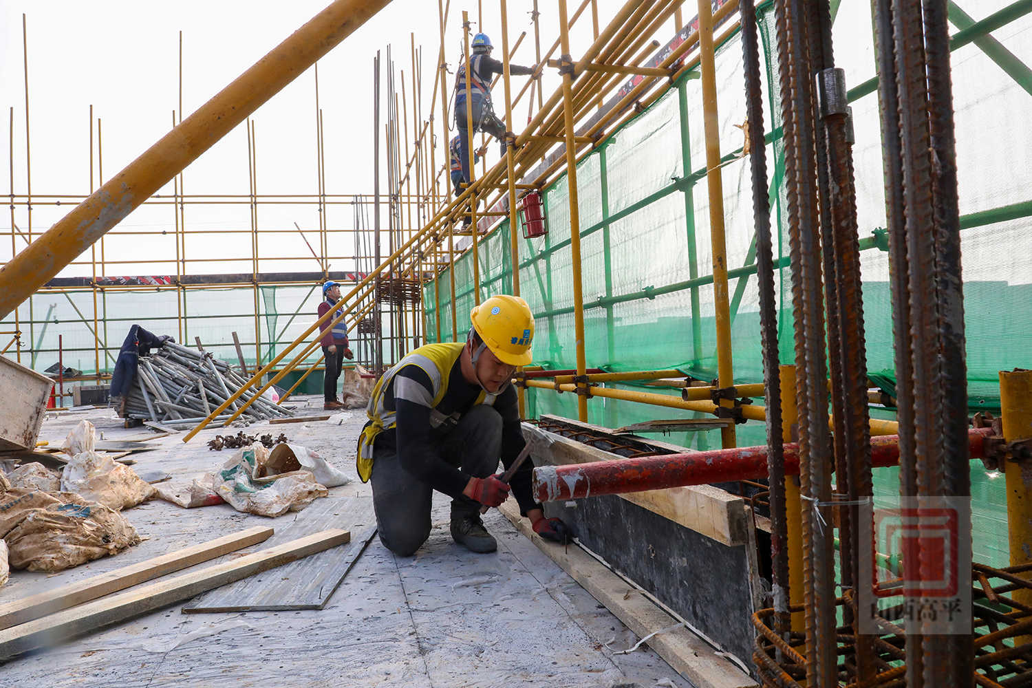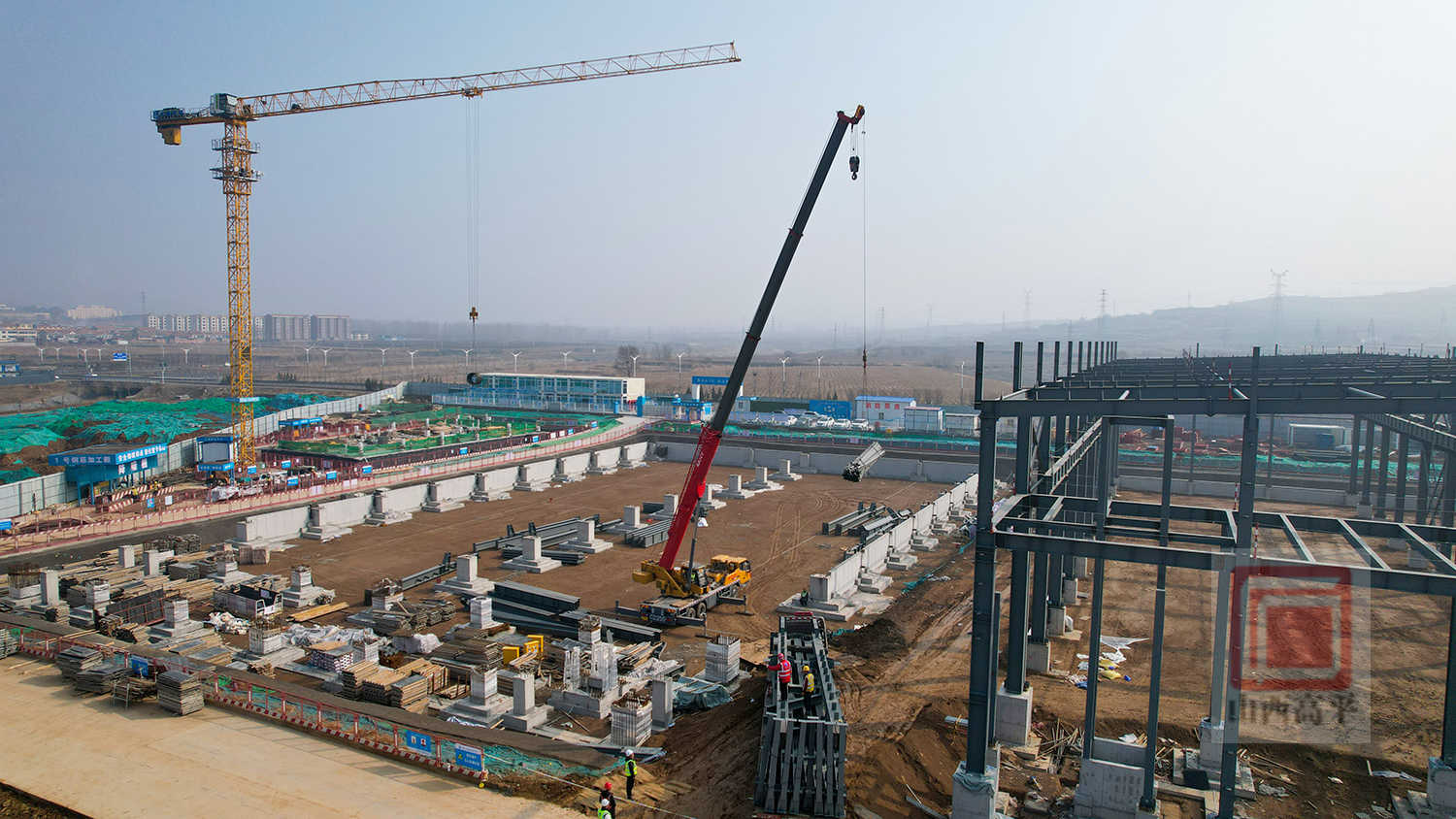 来到项目施工现场,塔吊、吊车协同配合,高效吊运大型钢结构构件。施工人员鼓足干劲,分工协作,有序进行钢筋切割、钢结构安装、模板支护等作业,掀起了复工建设热潮。