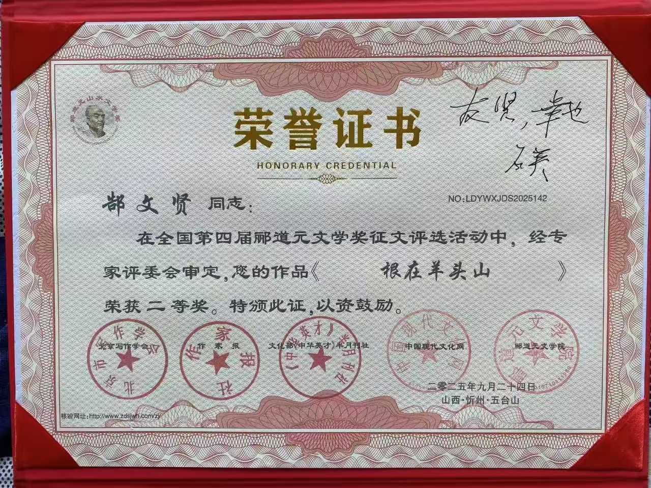 郦道元文学奖作为国家级权威奖项,由中国大众文学学会、北京写作学会、《作家报》、文化和旅游部《中华英才》半月刊社、郦道元文学院等多家权威机构联合主办。该奖项以地理学家郦道元命名,旨在弘扬郦道元《水经注》所蕴含的山水叙事传统,鼓励山水风光、人文历史题材的文学创作,是众多文学创作者展示才华的优质平台。该奖项自2018年以来已举办四届,评审流程包括初评、中评和终评三个阶段,获奖者将获得荣誉证书、定制奖杯及文学采风机会。在本届评选活动中,我市本土作家郜文贤创作的散文《根在羊头山》凭借深厚的文学内涵与独特的文化魅力脱颖而出。