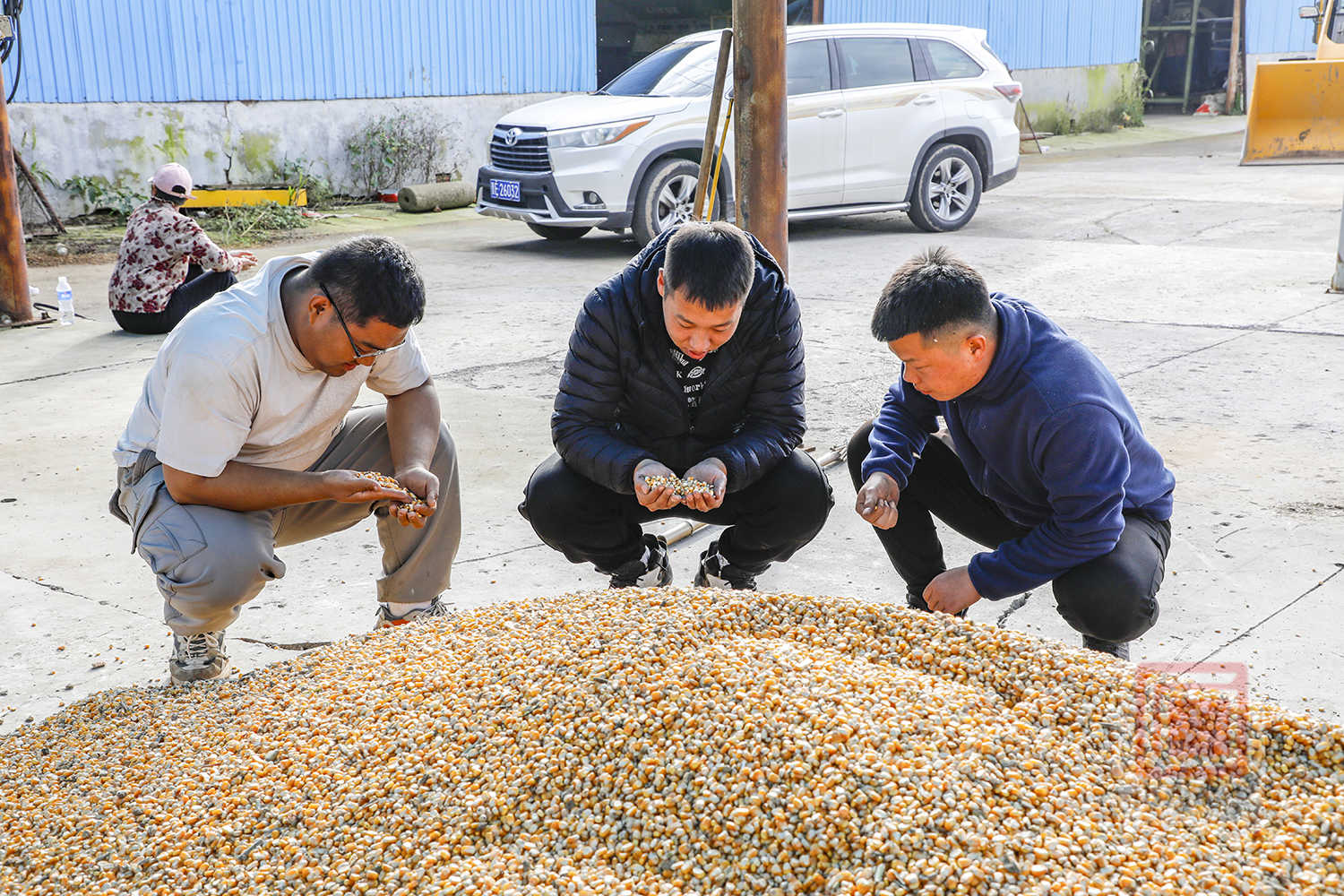 烘干厂负责人郑海强说:“我们收回来的玉米含水量大概是24.7%,需要进入烘干机烘干12个小时,含水量可降到15%以下,这样才能放入仓库储存,避免玉米发霉变质。”