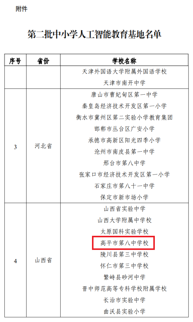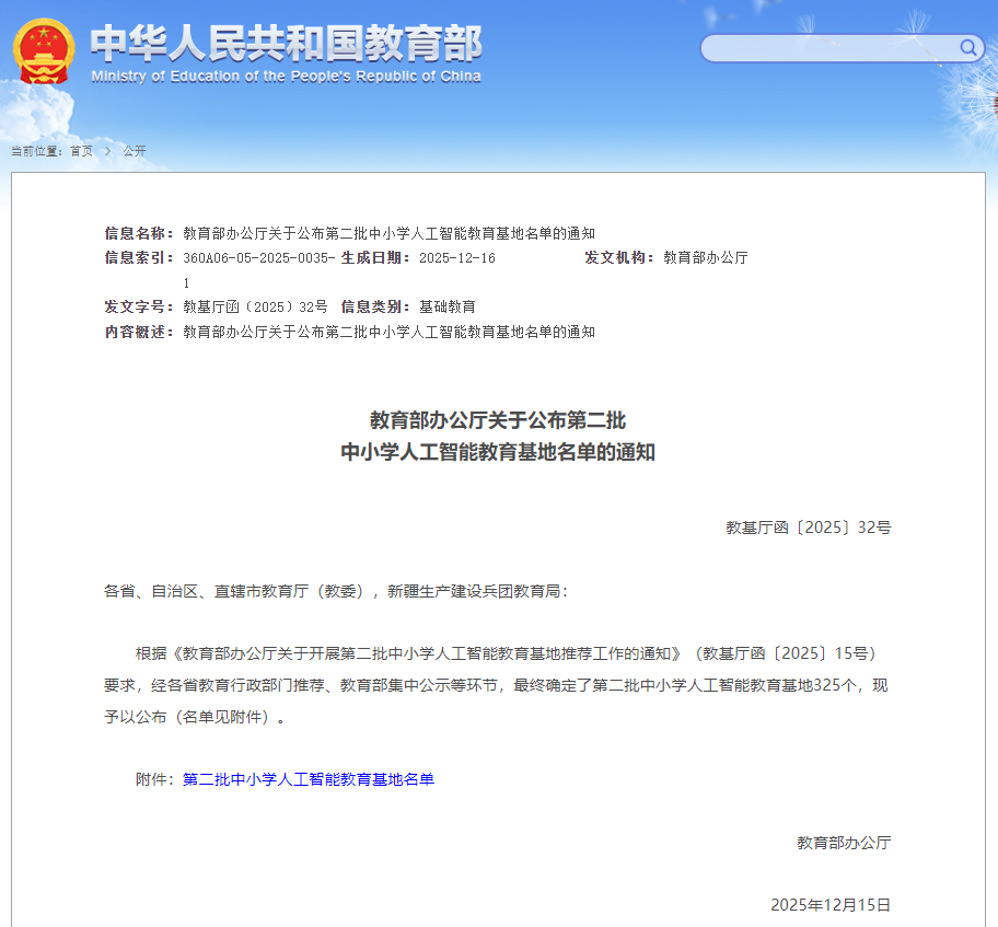 教育部公布第二批中小学人工智能教育基地名单 高平八中入选 来源:教育部 发布时间:2025-12-26 【字体:小 大】 如果内容不能正常显示,请更换浏览器进行重试 近日,教育部公布了第二批中小学人工智能教育基地名单。经各省教育行政部门推荐、教育部集中公示等环节,最终确定了第二批中小学人工智能教育基地325个。其中,高平八中成功入选。 本页二维码 【打印正文】