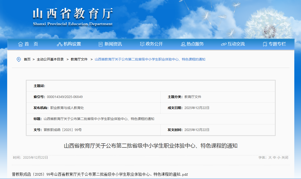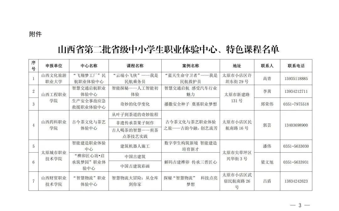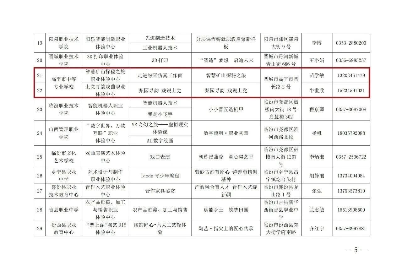 高平中专上榜!第二批省级中小学生职业体验中心、特色课程名单公布 来源:山西省教育厅 发布时间:2025-12-26 【字体:小 大】 如果内容不能正常显示,请更换浏览器进行重试 近日,省教育厅公布了第二批省级中小学生职业体验中心、特色课程的名单。其中,高平市中等专业学校申报的智慧矿山探秘之旅职业体验中心的《走进综采仿真工作面》、上党寻韵戏曲职业体验中心的《梨园寻韵 戏说上党》2个职业体验中心和特色课程入选。 本页二维码 【打印正文】