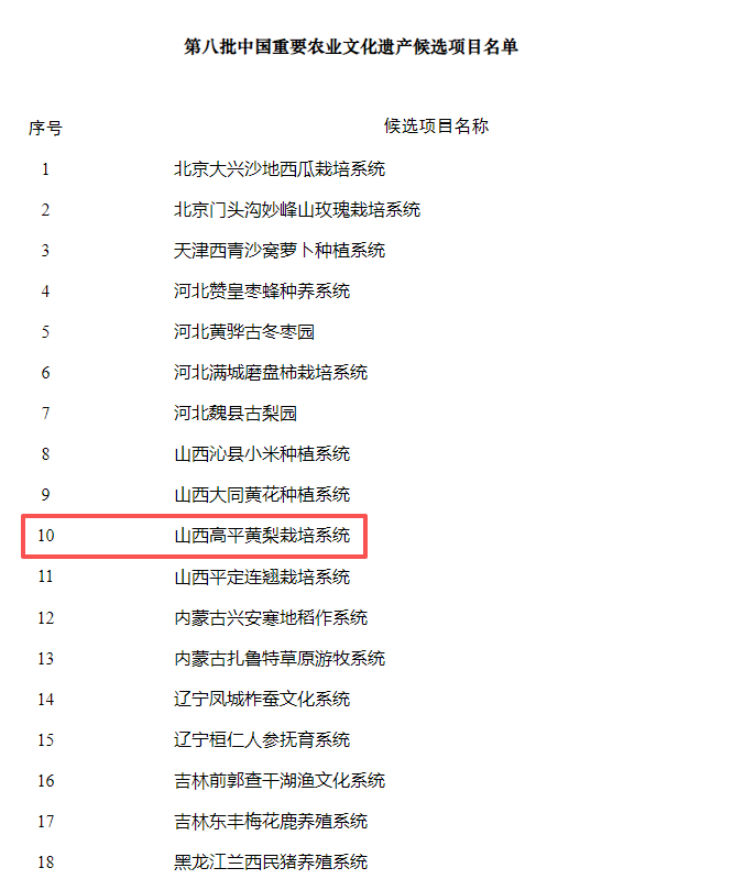 近日,农业农村部农村社会事业促进司发布第八批中国重要农业文化遗产候选项目名单公示,我市高平黄梨栽培系统成功入选,成为我市农业文化遗产领域的又一重要成果。