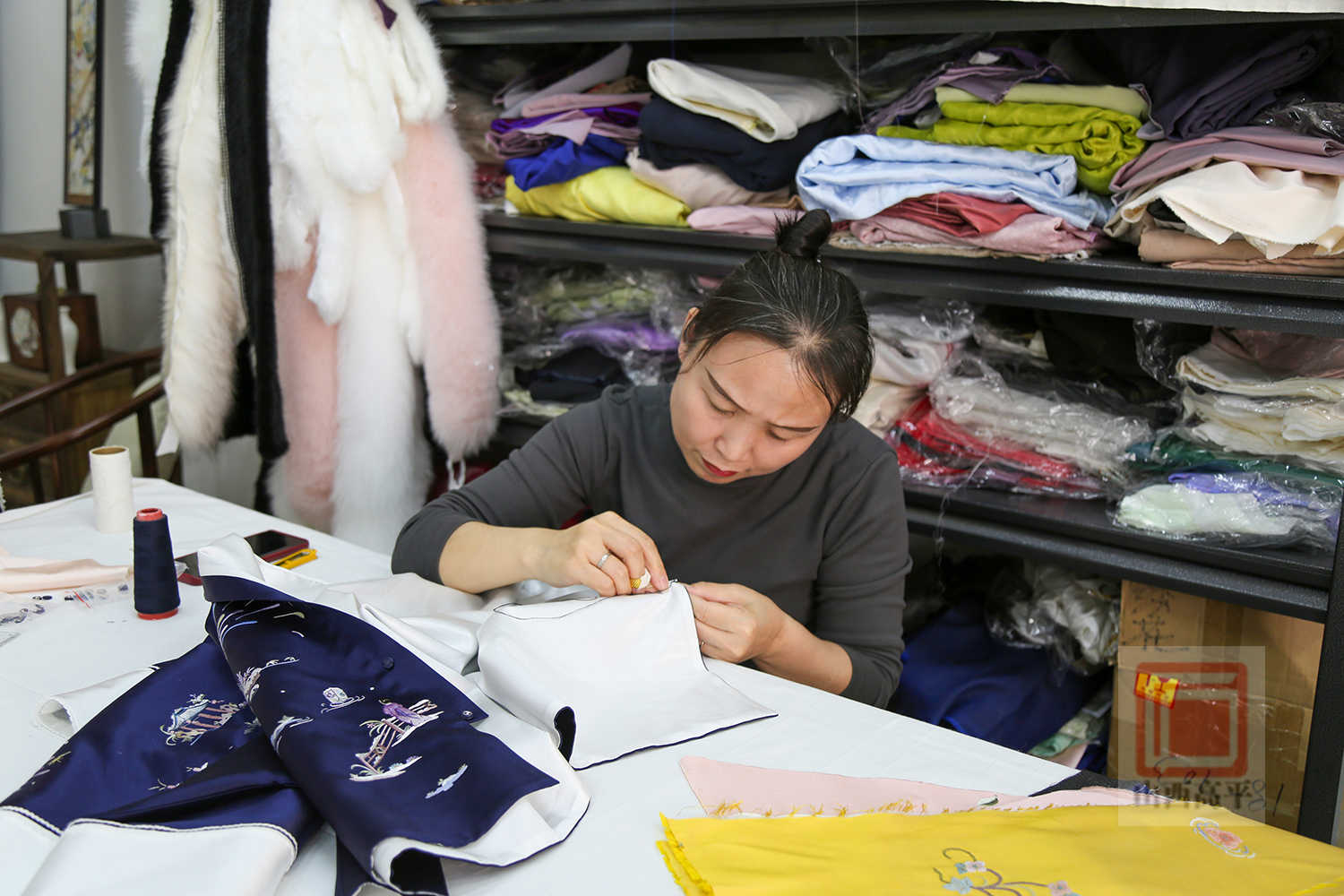 走进山居手工坊,设计师正潜心绘制最新纹样,裁剪工熟练剪裁布料……古建壁画云纹、传统民俗文化等都被一针一线绣入锦缎,珍珠在指尖穿梭中与丝线紧密结合。“一件衣服的诞生,前后要经历设计、选料、刺绣、缝制等数道工序,每一步都是对审美的考验。”手工坊负责人郭晓杰说道。