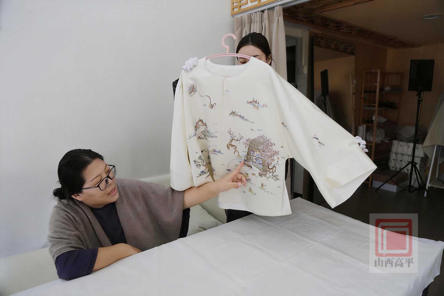 高平丰富的古建资源、深厚的民俗底蕴,是她们创作的灵感宝库。郭晓杰和年轻的设计师们常年入乡村、访庙宇,“古建元素就是我们区别于市场上其他新中式服装最大的特色。”郭晓杰指着一件成衣说,这是一款灵感源于开化寺壁画的衣裳,借鉴了壁画中对茅草屋与云纹的刻画,运用浮雕绣、打籽绣、翘粒绣等76种传统针法,历经反复试绣,才最终呈现出沉稳而灵动的效果。