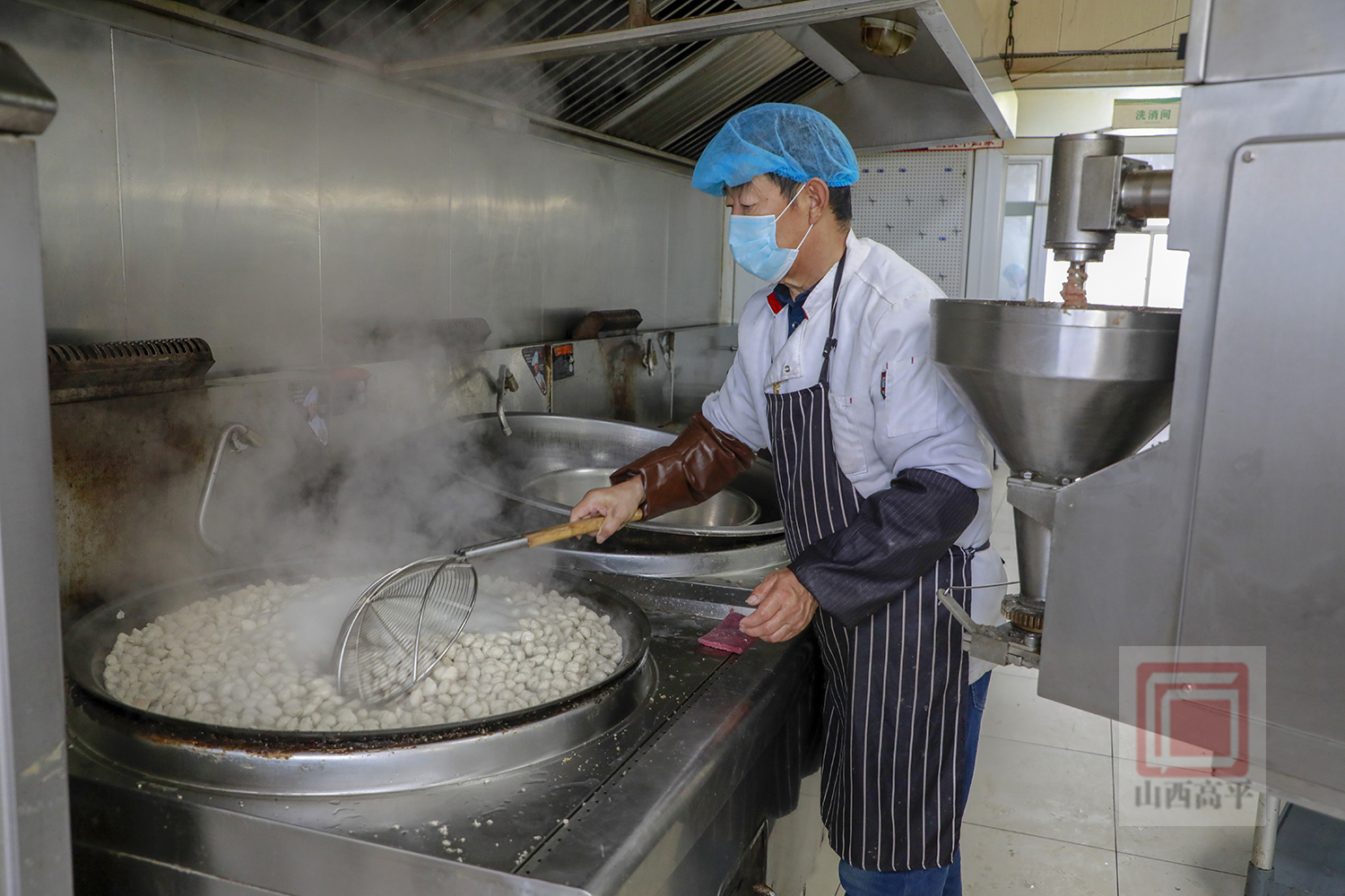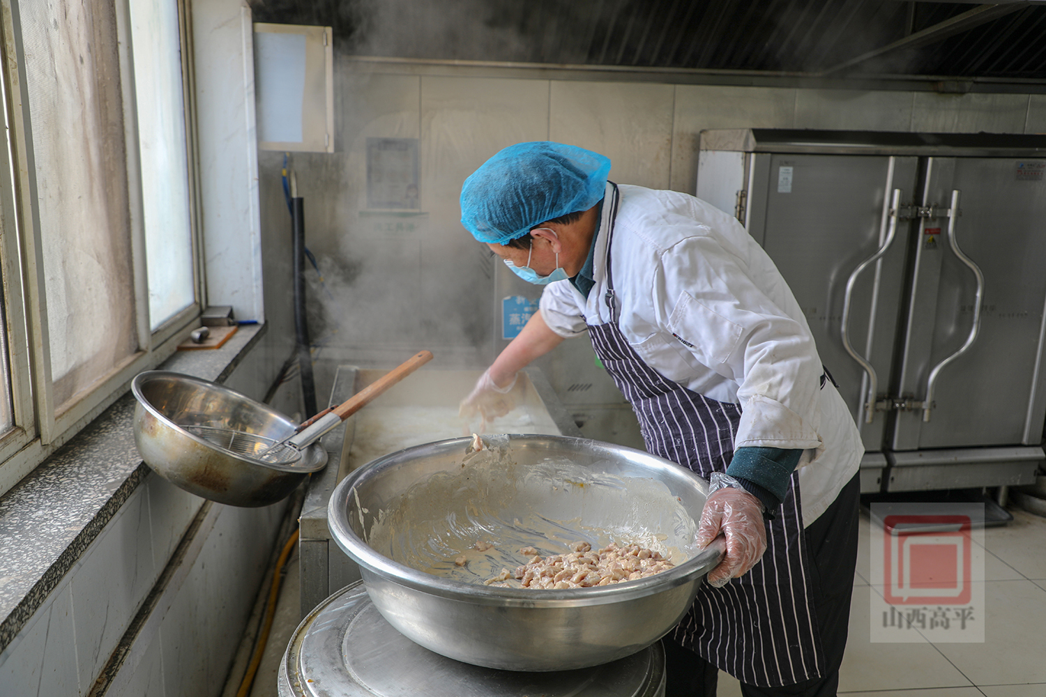 来到“高平十大碗”省级非物质文化遗产传承人孙永胜创办的翠岭茶楼,在标准化生产车间内,十余名烹饪师傅匠心烹制着每一道美食,从食材加工、调味、油炸、水蒸、晾制……每一道工序都遵循古法传统工艺进行制作。刚刚制作好的水白肉、核桃肉、小酥肉、天和蛋散发着蒸腾热气,香味扑鼻,此刻家常烟火气与浓郁年味交织。