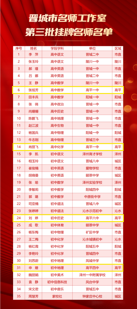祝贺!我市4名教师获评晋城市第三批挂牌名师 来源:高平教育之窗 发布时间:2026-04-08 【字体:小 大】 如果内容不能正常显示,请更换浏览器进行重试 4月3日上午晋城市名师工作室培树工程年度总结大会暨第三批名师工作室命名仪式在晋城一中举行高平一中教师张旭芳、肖丽飞高平四中教师申姗高平六中教师刘婷4名教师成为晋城市第三批挂牌名师 仪式上,我市挂牌名师李文敏作为优秀代表围绕工作室核心工作,现场展示运行情况及取得的阶段性成果。李文敏名师工作室连续三年被评为“晋城市优秀工作室”。 本页二维码 【打印正文】