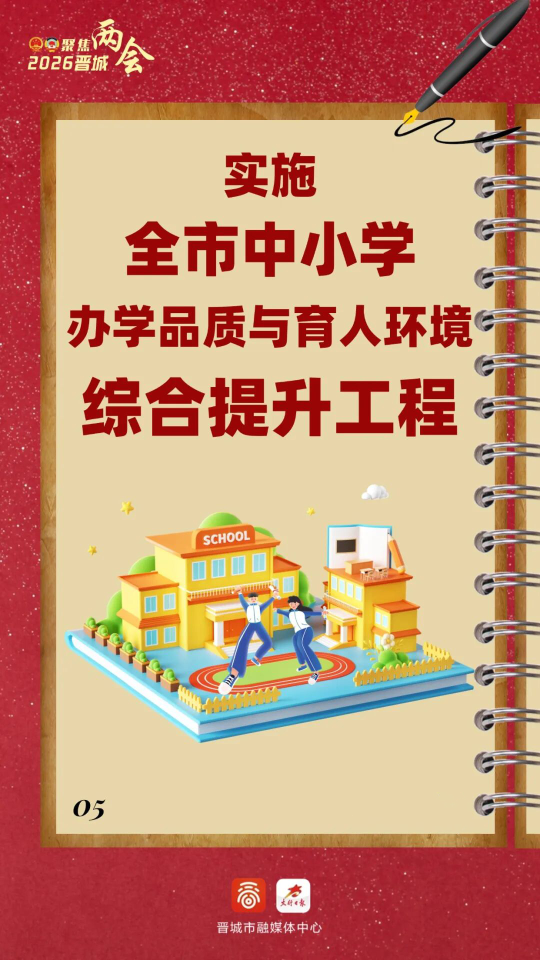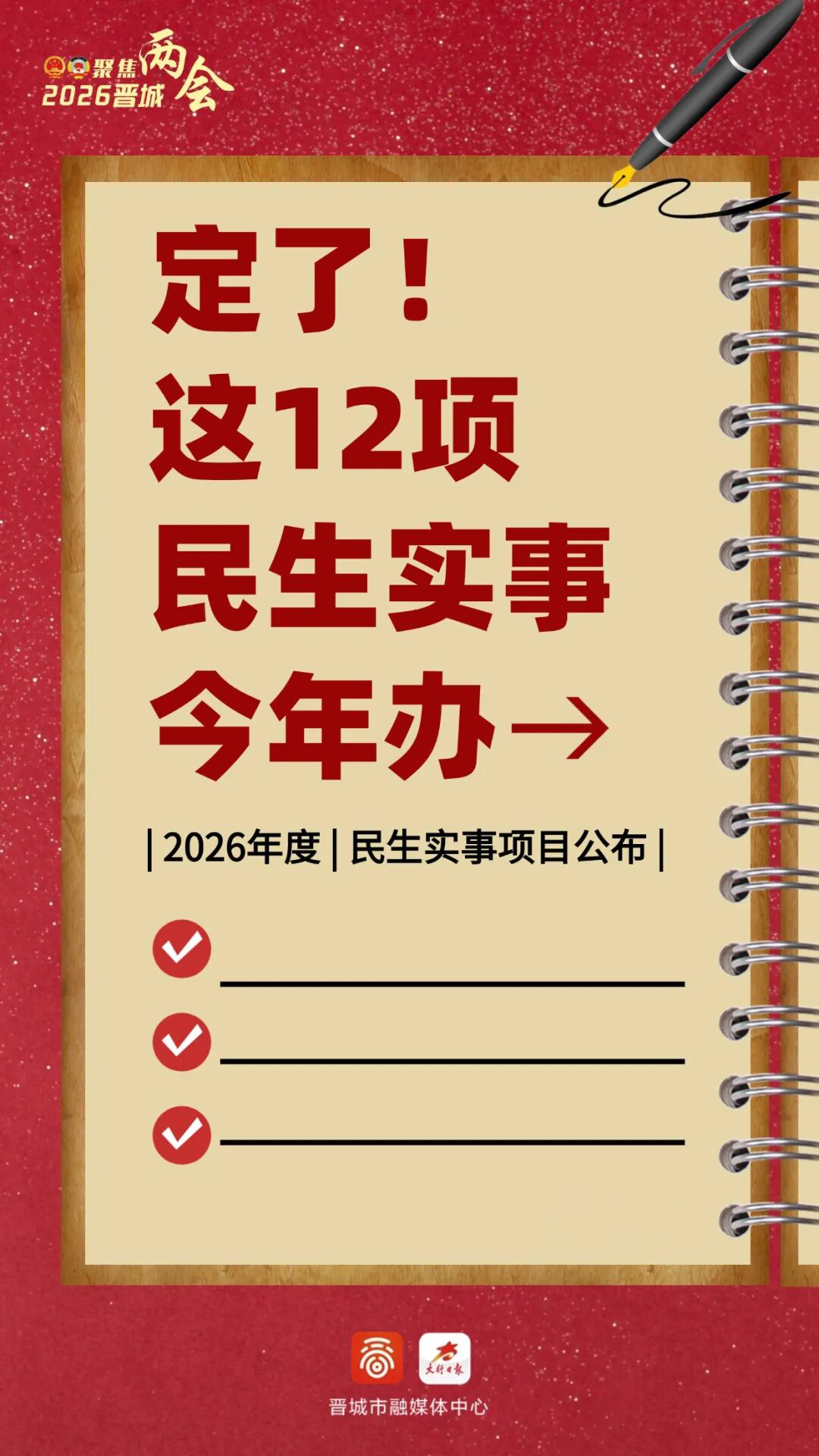 晋城重磅发布!2026年12件民生实事 来源:晋城市人民政府网 发布时间:2026-01-27 【字体:小 大】 如果内容不能正常显示,请更换浏览器进行重试 定了!2026年晋城市要办好这12件民生实事,这些实事聚焦“一老一小”、就业保障、教育提升、公共安全、文化体育等多个领域,一起来看看。实事连民心,实干赢未来!2026,晋城加油! 本页二维码 【打印正文】