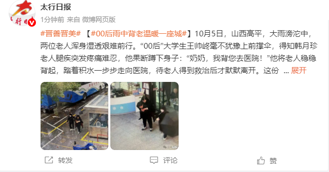 近日,“00后”晋城小伙雨中背老人的一则微博迅速传开。网友看后纷纷直呼:“这一幕,很暖!”