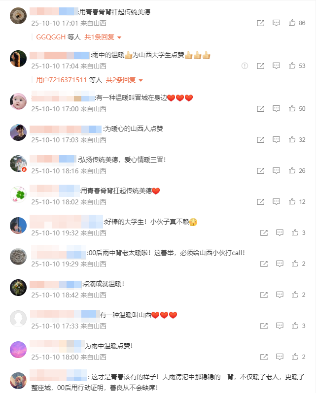网友纷纷留言点赞:“用青春脊背扛起传统美德”“有一种温暖叫晋城在身边”“好棒的大学生!小伙子真不赖”