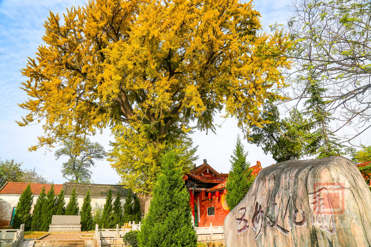 据了解,这棵银杏树高35米,周长5米。已经有1000多年的树龄了,在阳光的映照下熠熠生辉,与红墙古建相映成趣,构成一幅绚烂的秋日画卷。每年的10月下旬到11月中旬是这棵银杏树的最佳观赏期。