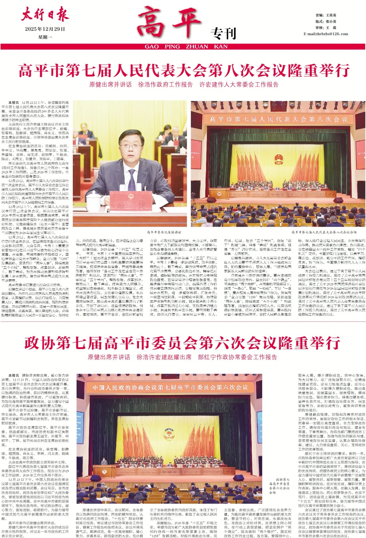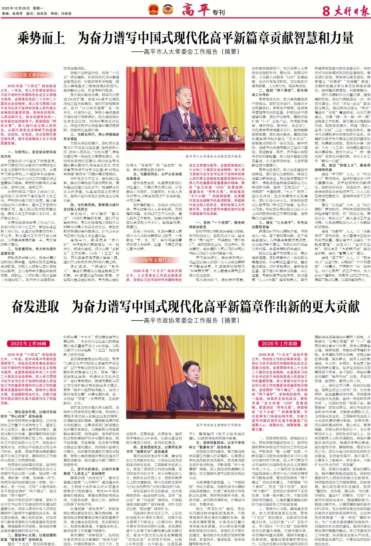 12月21日至24日,备受瞩目的政协第七届高平市委员会第六次会议、高平市第七届人民代表大会第八次会议隆重举行。会议通过了关于高平市人民政府工作报告的决议、关于高平市国民经济和社会发展第十五个五年规划纲要的决议、关于2025年国民经济和社会发展计划执行情况与2026年国民经济和社会发展计划的决议、关于高平市2025年财政预算执行情况和2026年财政预算的决议、关于高平市人民代表大会常务委员会工作报告的决议、关于政协高平市委员会常务委员会工作报告的决议。