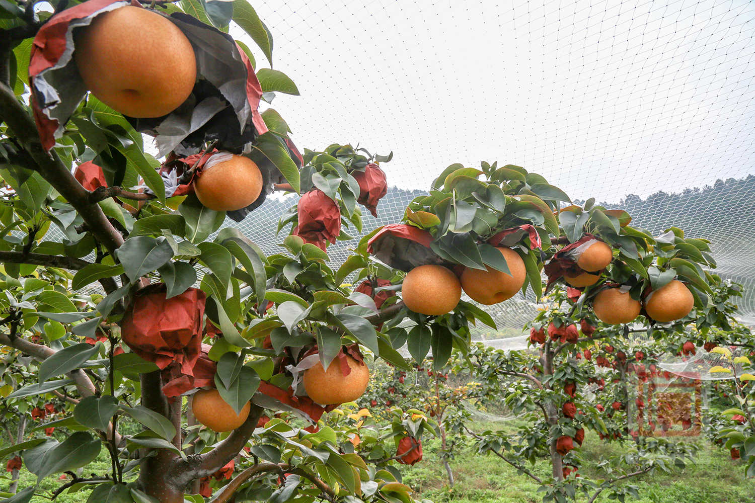 走进采摘园,果香阵阵,个头匀实、色泽泛红的晚秋黄梨缀满枝头。村民们手提小桶穿梭于梨树间,动作娴熟地采摘、装筐,脸上洋溢着丰收的喜悦。