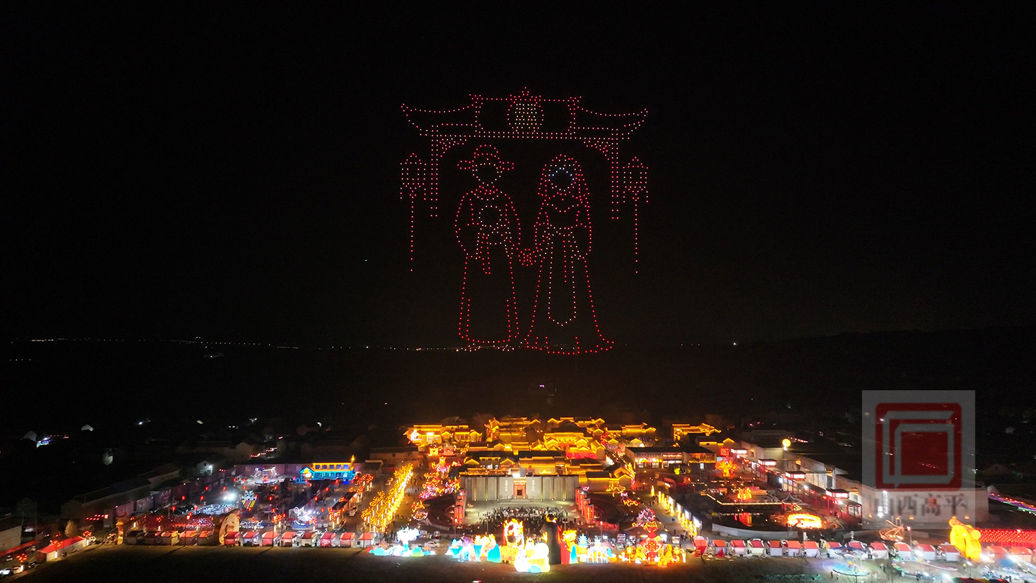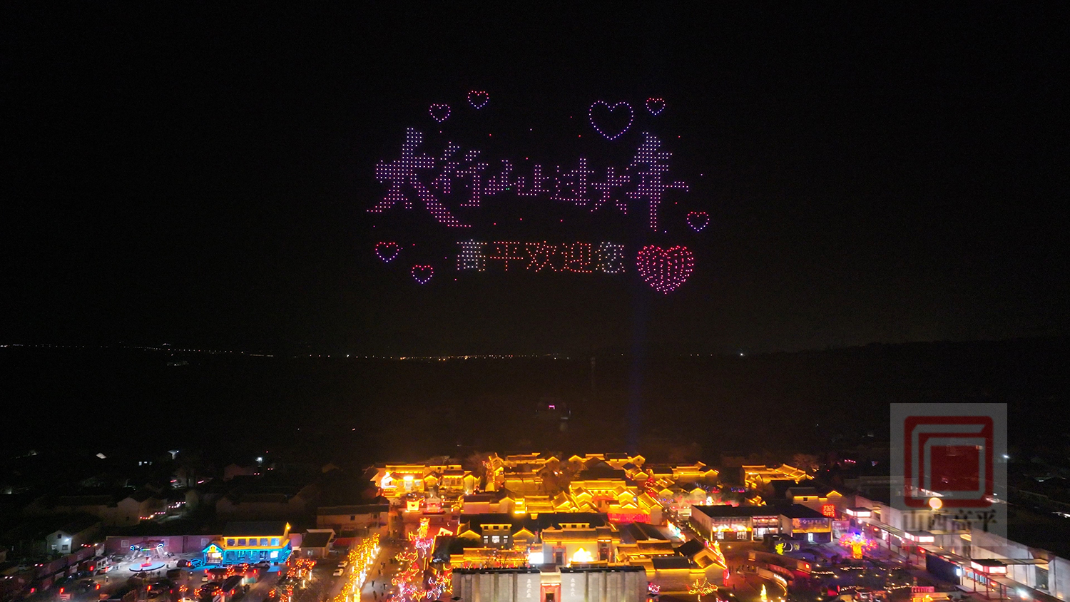 2月14日,喜镇苏庄举办无人机星空秀演出,为现场情侣和游客打造了一场兼具浪漫气息与喜庆年味的视觉盛宴。