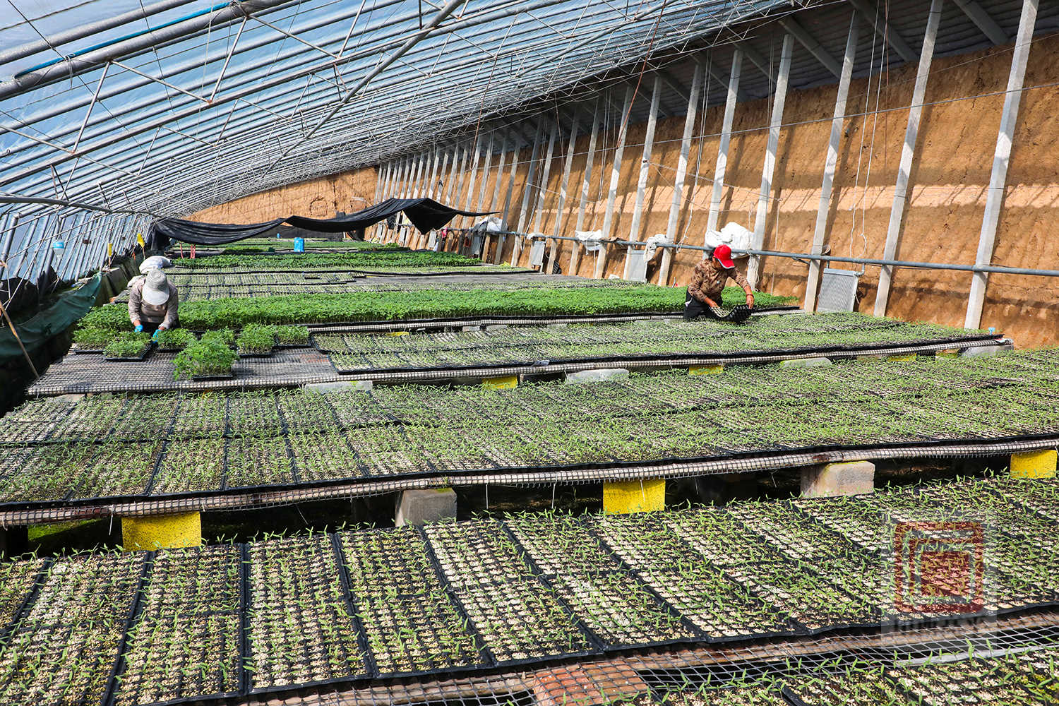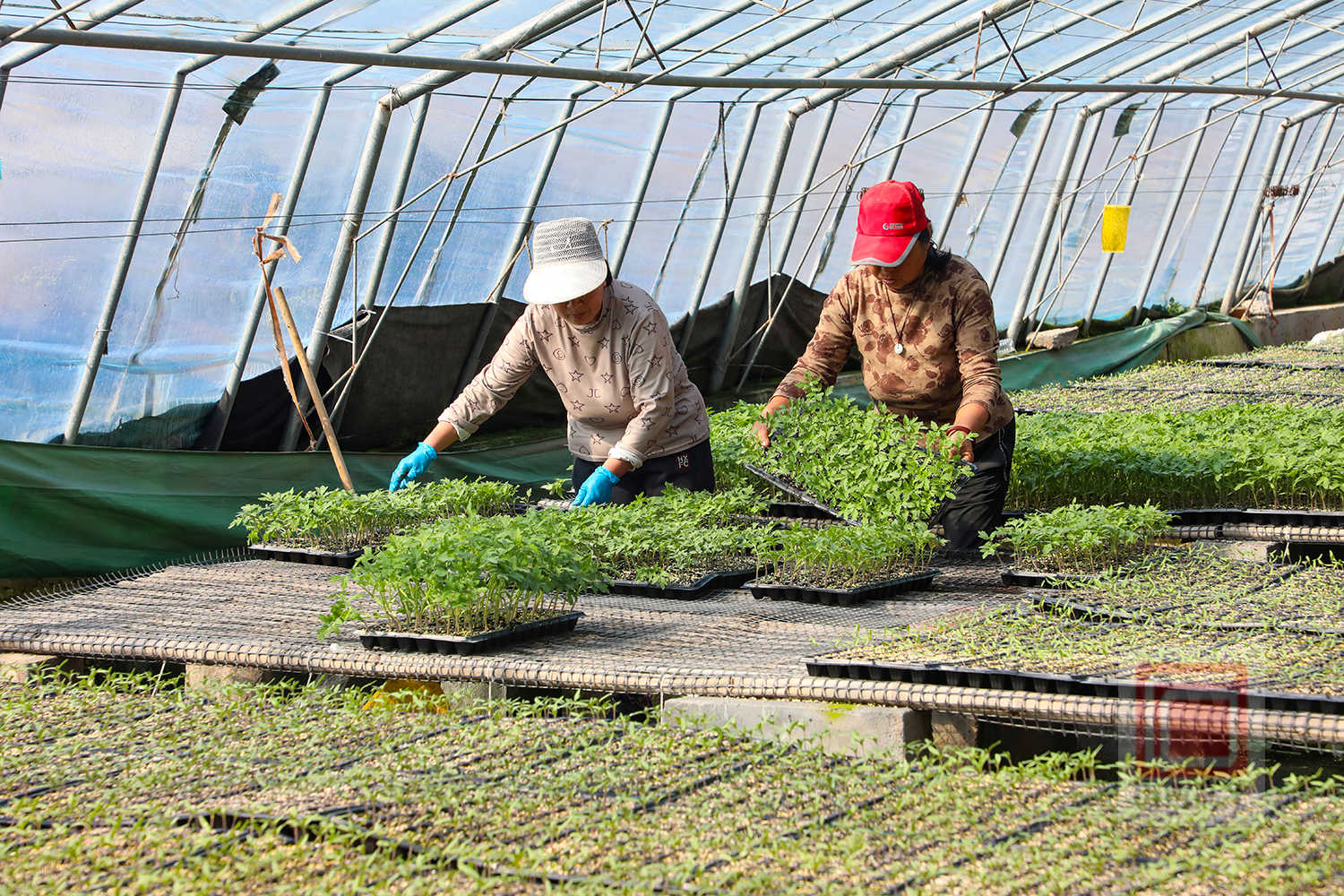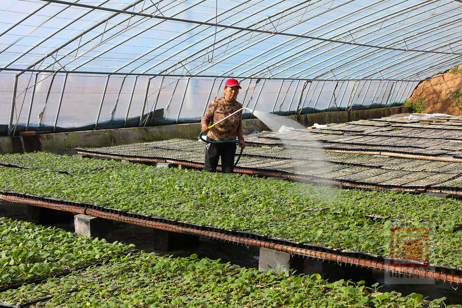 走进合作社温室大棚,一排排育苗盘整齐摆放,各类蔬菜种苗破土而出、鲜嫩翠绿,一派春意盎然。村民们正忙着摆盘、疏苗、浇水、通风,细致开展种苗管护每一道工序,促进种苗茁壮生长。