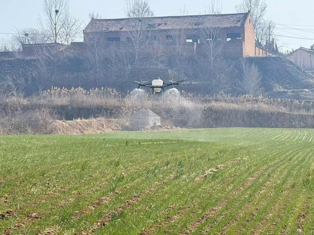 “今年我们采用无人机进行‘一喷三防’作业,不仅效率高、效果好,还能避免人工喷洒踩伤麦苗。”现场作业的技术人员介绍道,“针对部分麦田苗情偏弱的实际,我们在农技人员的指导下,对药剂和叶面肥的配比进行了科学调整,确保防病治虫和促弱转壮精准有效。”