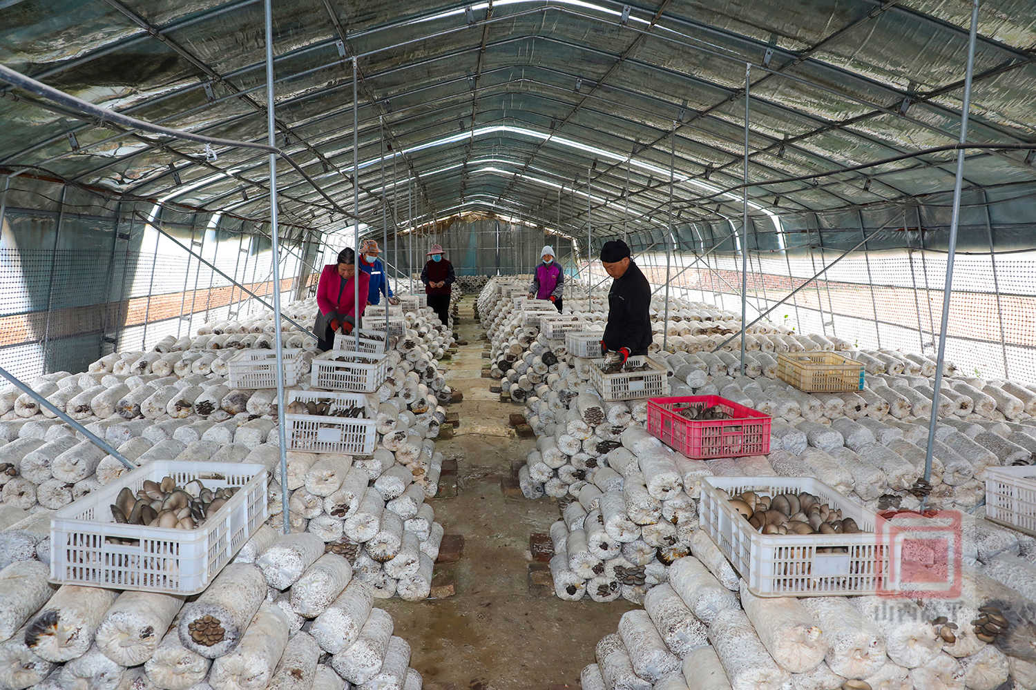 走进平菇食用菌大棚,一股浓郁的菌香扑鼻而来。一排排菌袋整齐摆放,一簇簇平菇从菌棒中破袋而出,宛如层层叠叠的小伞,肥厚饱满、长势喜人。村民们穿梭其间,娴熟地摘下饱满、品相好的平菇,然后分拣、装袋,现场一派丰收景象。