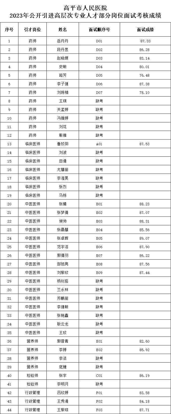 高平市人民医院2023年公开引进高层次专业人才部分岗位面试考核成绩公布 来源:高平市人民医院 发布时间:2023-04-10 【字体: 小 大】 高平市人民医院2023年公开引进高层次专业人才部分岗位面试考核工作于2023年4月8日完成,现将成绩予以公布。 附件:《高平市人民医院2023年公开引进高层次专业人才部分岗位面试考核成绩》高平市人民医院2023年4月10日 本页二维码 【打印正文】