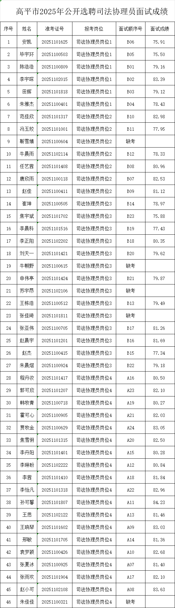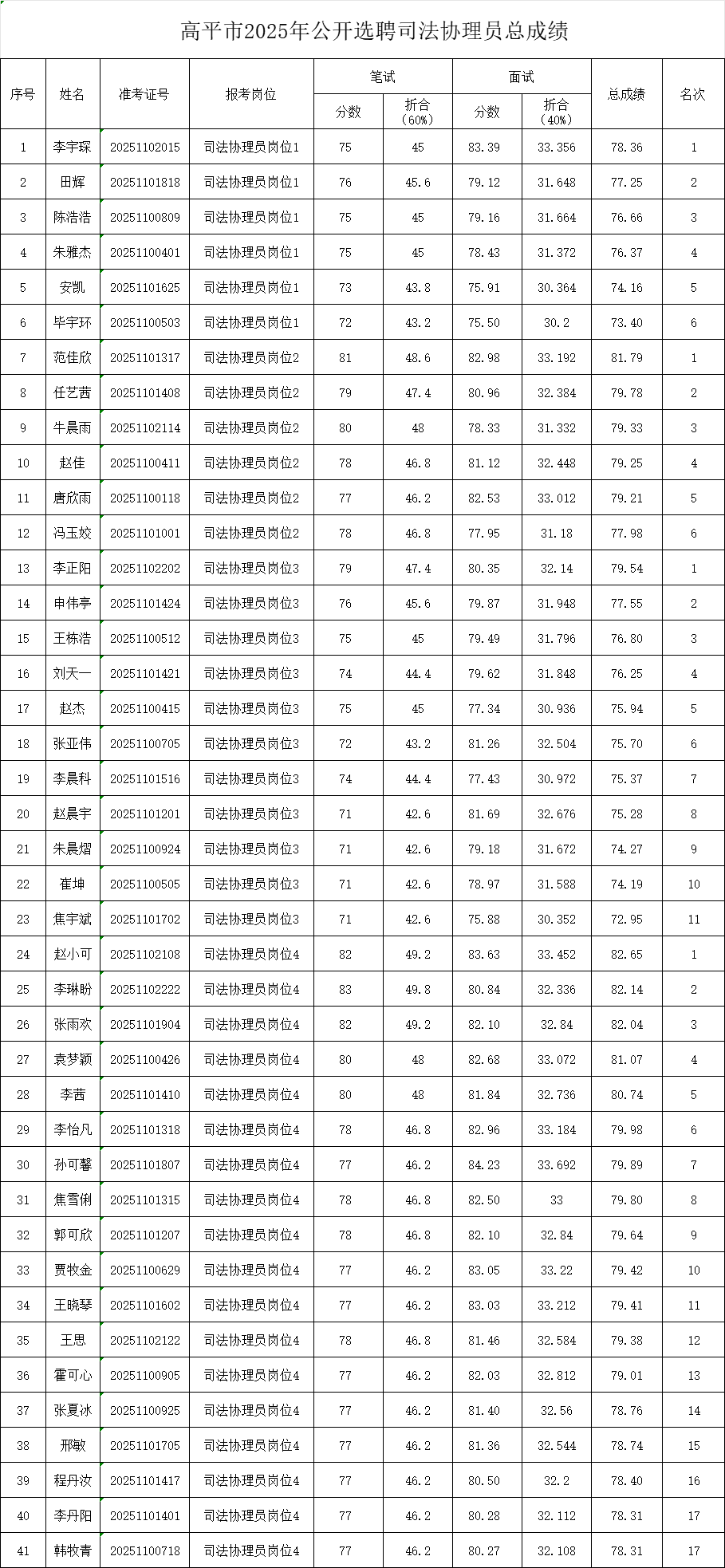 高平市2025年公开选聘司法协理员面试成绩、总成绩公布 来源:高平市司法协理员制度试点工作领导组办公室 发布时间:2025-12-16 【字体: 小 大】 高平市2025年公开选聘司法协理员面试工作已完成,现将面试成绩、总成绩予以公布。 附件: 1.《高平市2025年公开选聘司法协理员面试成绩》 2.《高平市2025年公开选聘司法协理员总成绩》高平市司法协理员制度试点工作领导组办公室2025年12月16日 本页二维码 【打印正文】