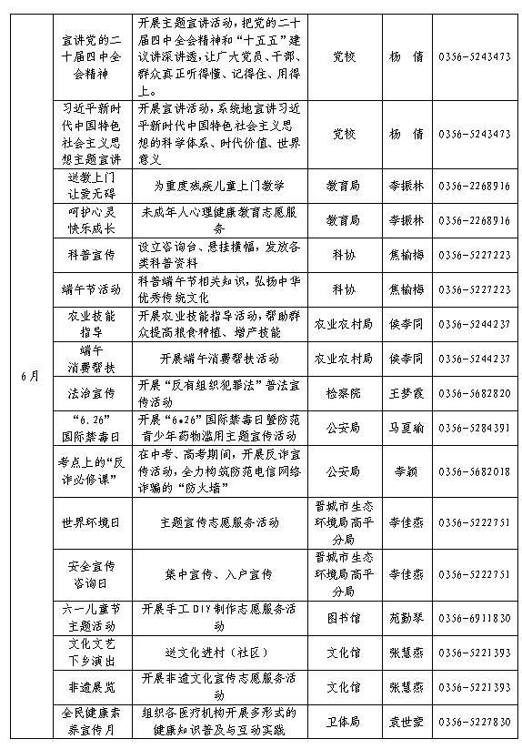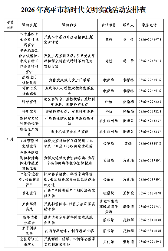 为扎实推进2026年高平市新时代文明实践工作,市新时代文明实践中心全面征集、系统汇总各志愿服务支队的文明实践计划,筛选代表性的活动,形成《2026年高平市新时代文明实践活动计划》。为使活动项目更好地服务于基层和广大群众,现将新时代文明实践活动计划予以公示。各单位和广大群众可通过电话、“今日高平”APP或直接到市新时代文明实践中心(所、站)及各单位“点单”,中心将及时予以“派单”,按群众需求在规定范围内推动实践活动项目落地基层、惠及群众。
