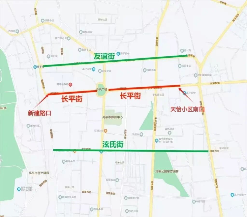 途经长平街可绕行泫氏街、友谊街。