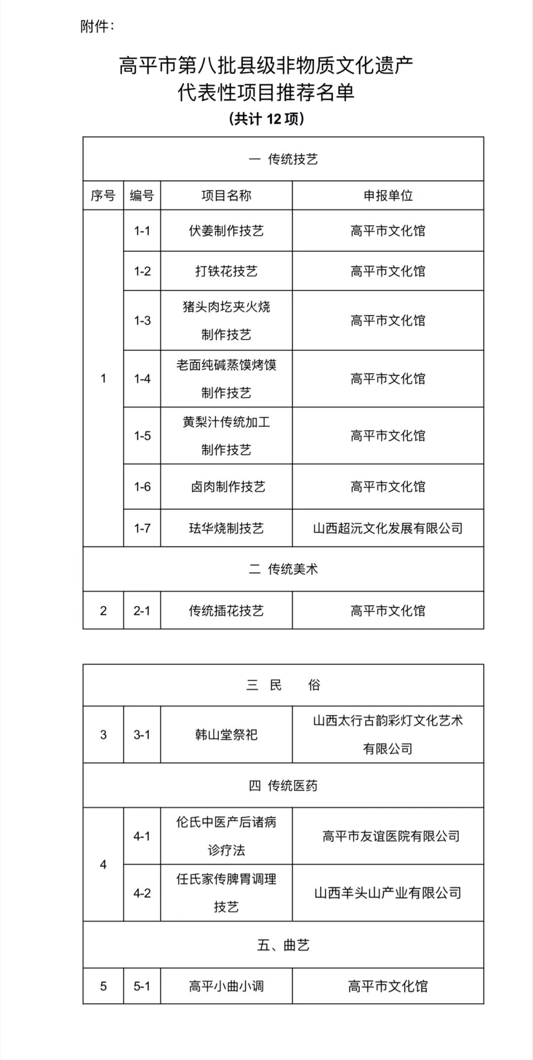 根据《中华人民共和国非物质文化遗产法》《国务院办公厅关于加强我国非物质文化遗产保护工作的意见》(国办发〔2005〕18号)和《山西省非物质文化遗产条例》精神,2026年3月高平市文化和旅游局部署文化馆实施开展了第八批高平市县级非物质文化遗产代表性项目的申报工作。经专家评审委员会认真审议,现拟定第八批高平市县级非物质文化遗产代表性项目名录12项,现予公示。