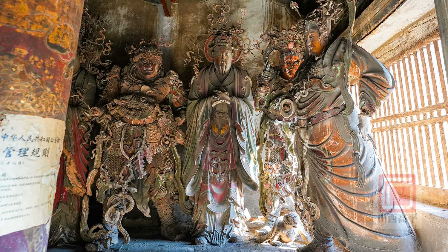 冬至前后,正午太阳高度角达到一年中的最小值,阳光以极低的角度越过屋檐,照进殿内。随着光线移动,一尊尊彩塑的面部表情、发冠装束、服饰纹理被一一照亮,熠熠生辉。一堂彩塑,满堂喝彩。在光线的映射下,崇宁真君身上的铠甲泛起金色光泽,昭惠真君一身正气,阎摩罗王、散脂大将、娑竭罗龙王、深沙大将的面部轮廓、动作神态清晰可见,尽显神像威严,带给了游客极强的艺术感染力和视觉冲击力。