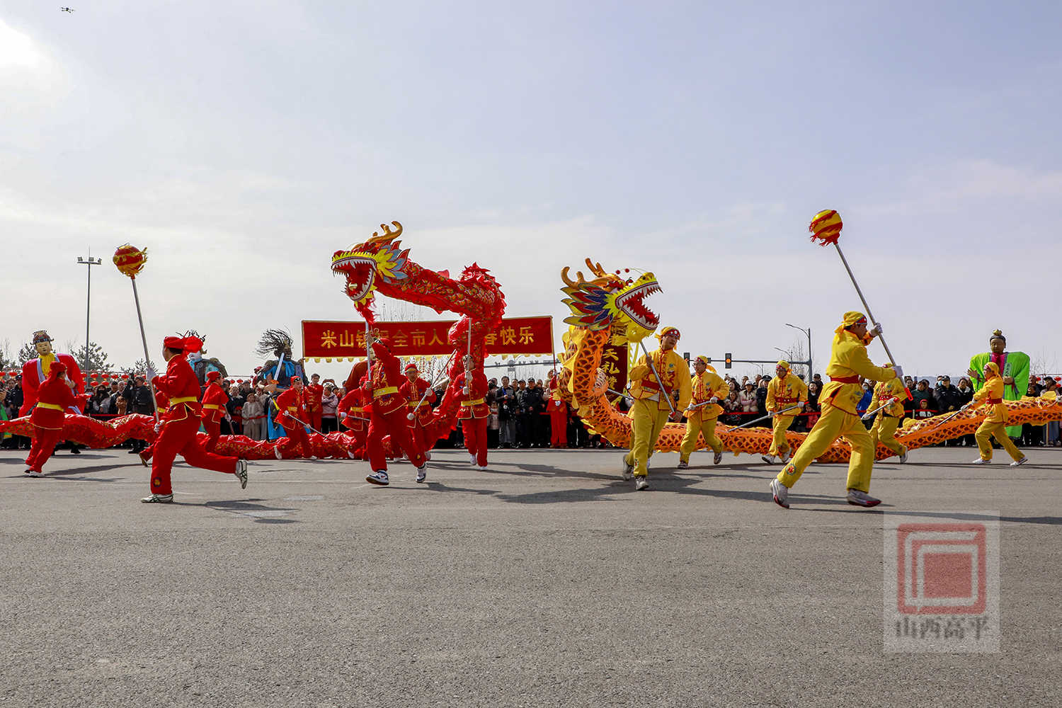 在高铁新区站前南街,锣鼓齐鸣,人声鼎沸。元宵节文化活动在米山镇带来的《诸天礼赞》耍乐故事中拉开帷幕。伴着黑神话主题曲《三界四洲》激昂的旋律响起,演员们身着二十四诸天彩塑华服惊艳登场,锣鼓、舞龙穿插其间,尽显喜庆欢腾。马村镇上演的《龙马威狮鼓韵马村》耍乐故事,通过“非遗+科技”融合,让跑竹马、舞狮表演更显科技范。紧接着,鼓舞、扇舞、扛桩、腰鼓等耍乐故事接连上演,或喜庆热烈,或逗趣诙谐的表演,引得围观群众连连叫好。