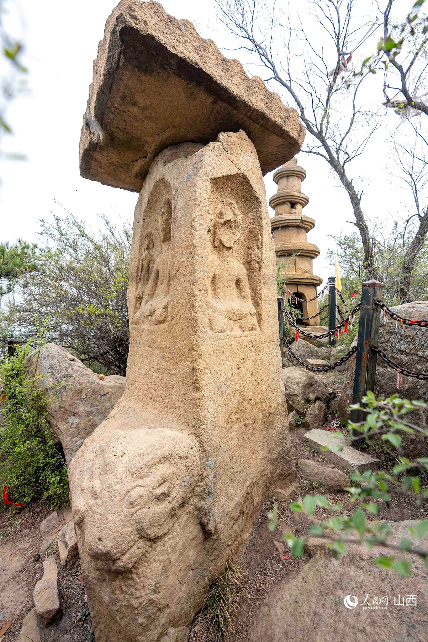 晨曦中白雾茫茫,山峦重叠如波浪般起伏变化,朝阳照进来,阳光如线,一缕一缕,为峰峦披上霞光染红的雾纱,让初醒朦胧的姿态舒展开来。待雾散尽,山体裸露,突起的岩石如肌肤似筋络,透过绿色的外披,给人一种强烈的诱惑。傍晚,落日余晖更像胭脂,抹红了天际,抹红了山巅,抹红了巍巍双塔和羊头石造像碑。“日夕诸山俱暝,此峰返照犹光。”此即古代高平八景之一“羊头夕照”也!有诗云: