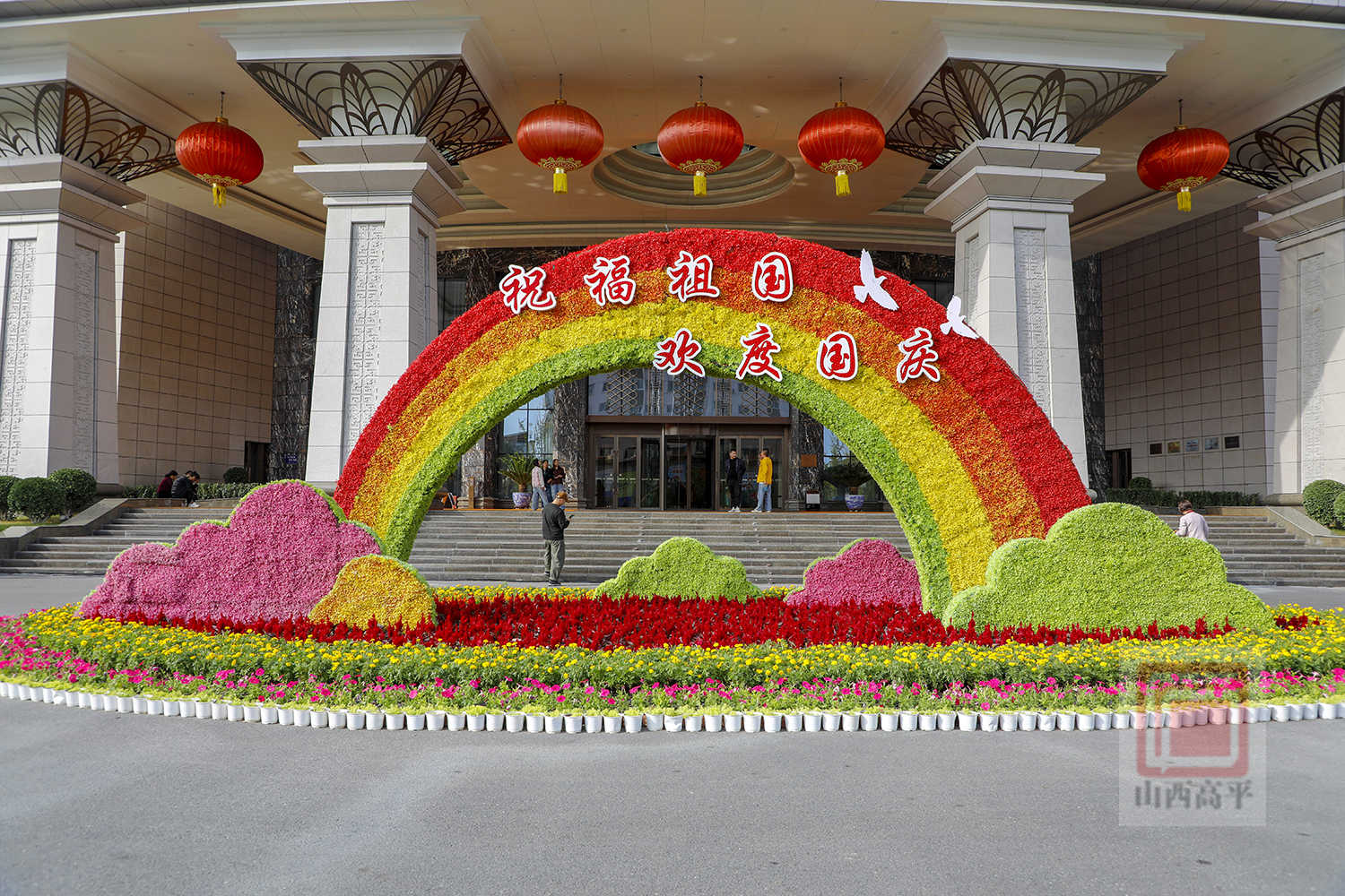 火车站前花团锦簇,色彩艳丽的景观花卉与飘扬的国旗交相辉映。高平大酒店门口,造型别致的主题花卉点缀其间,将节庆氛围烘托得愈发浓郁。
