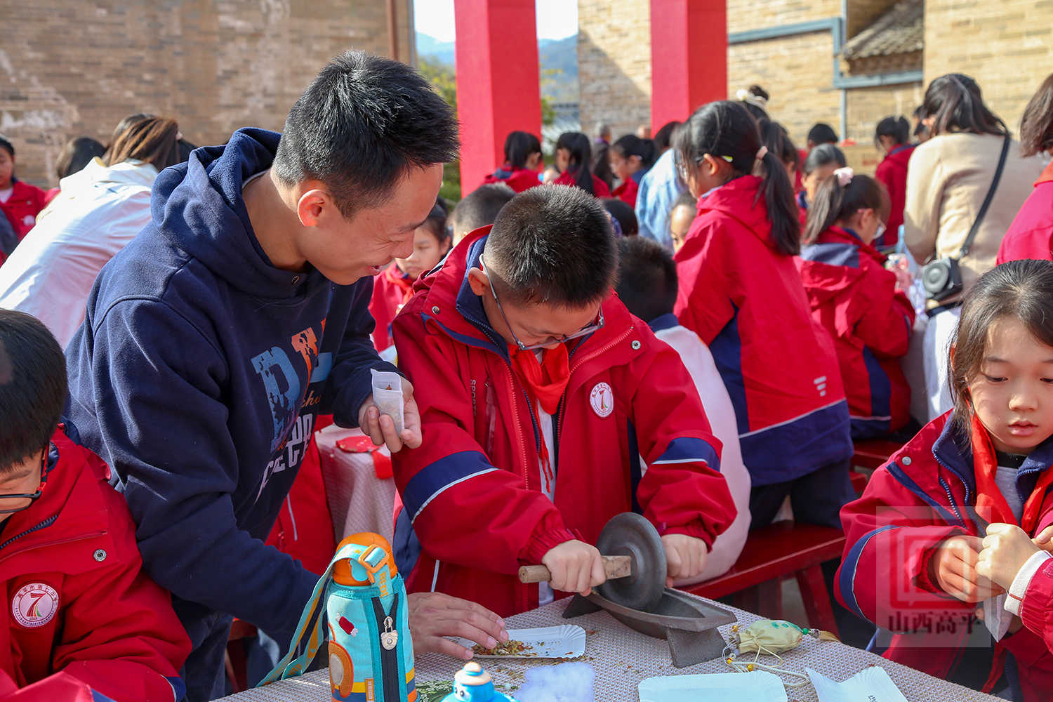 在中药材香囊制作环节,学生们围坐桌前,认真挑选中药材、碾碎、填充,亲手制作香囊,了解传统中医药文化。