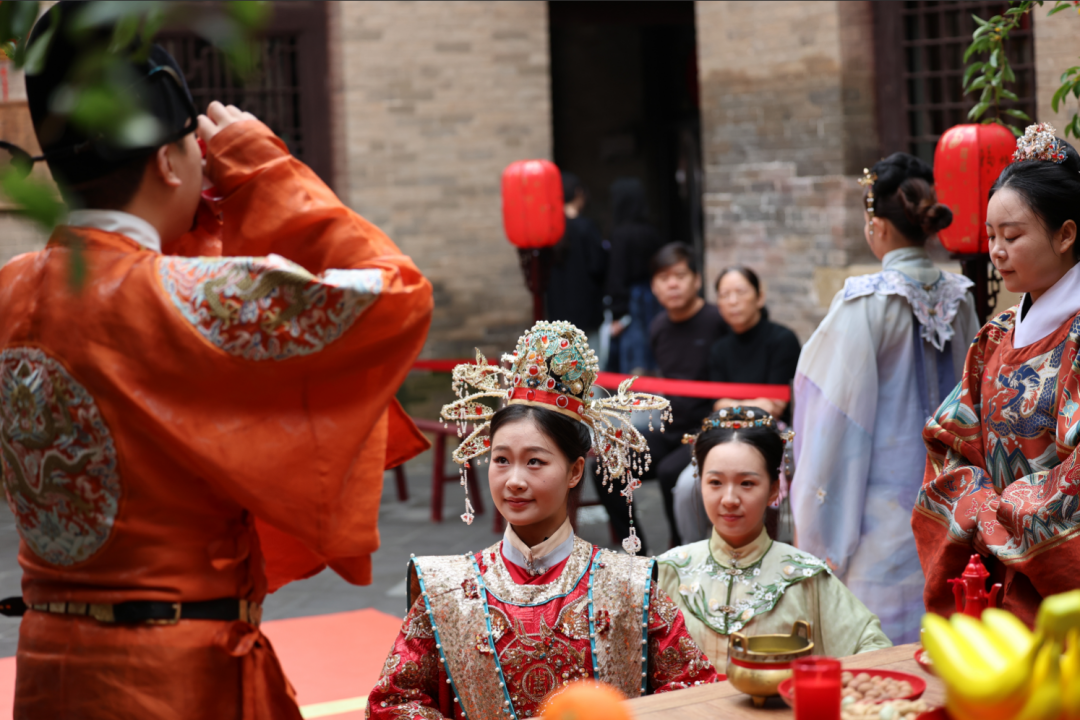 苏庄各个院落同步开启银票互动:账房院投壶竞技、连理院成语接龙、春明院穿针引线,游客闯关沉浸式感受古风乐趣;每日定时上演的《迎宾礼》《出阁礼》《十里红妆》等婚俗展演,让游客在喜庆中读懂传统“喜”意,专场文艺晚会更添视听享受。