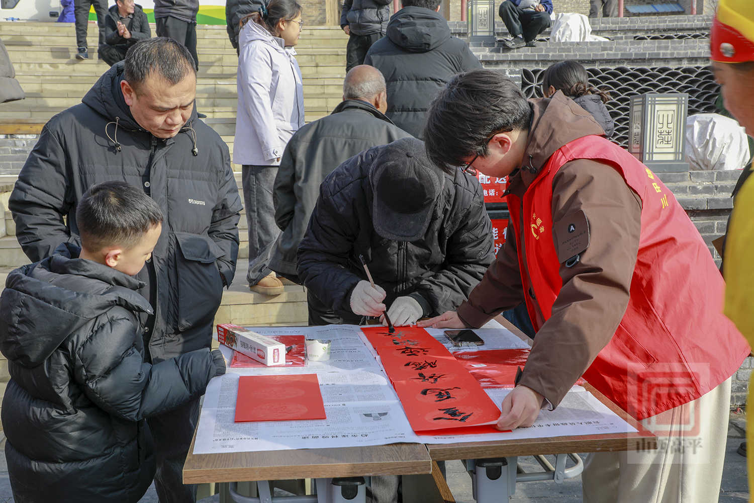 活动现场还同步开展了义写春联、发放腊八粥活动。书法家们挥毫泼墨,将新春祝福融入一副副春联中。工作人员将热气腾腾的腊八粥送到村民手中,暖胃更暖心。村民们领到手写的春联,喝着腊八粥,感受到了浓浓的年味。