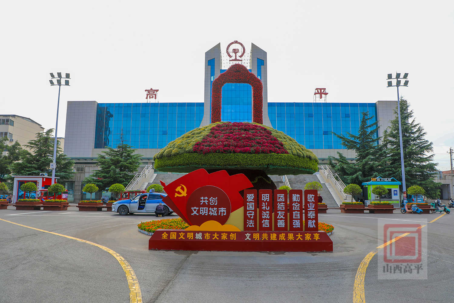 火车站前花团锦簇,色彩艳丽的景观花卉与飘扬的国旗交相辉映。高平大酒店门口,造型别致的主题花卉点缀其间,将节庆氛围烘托得愈发浓郁。