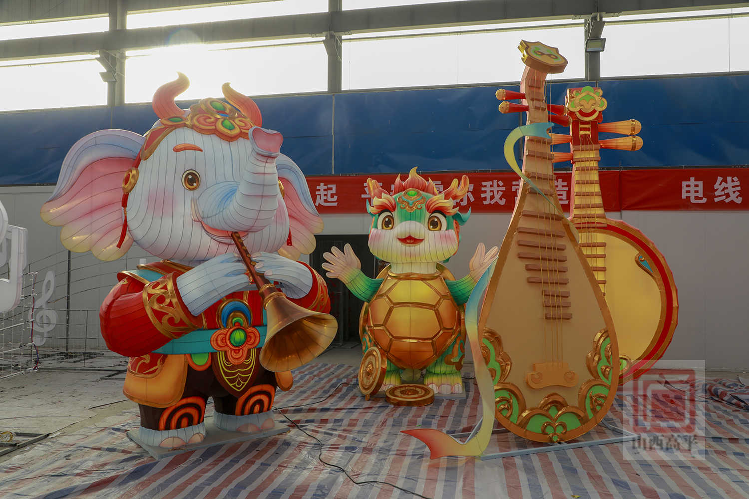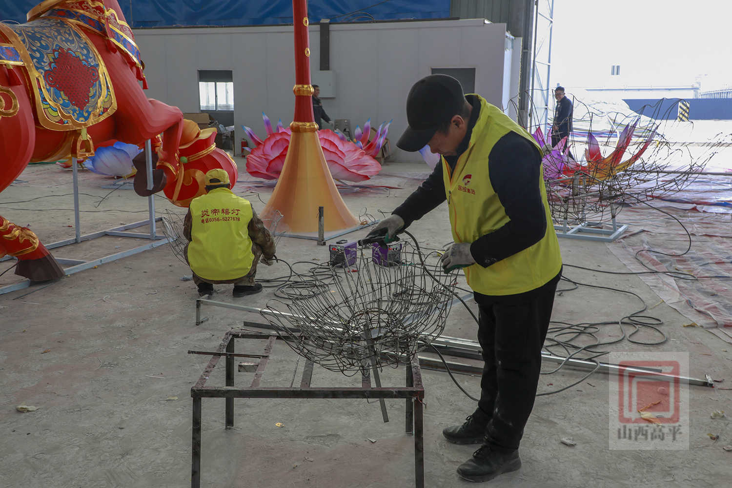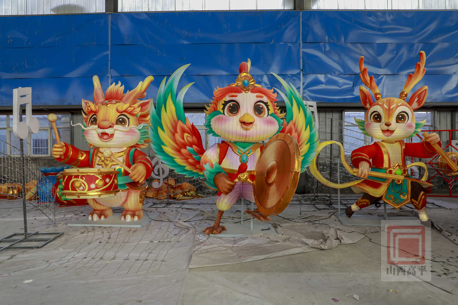 在制作环节,工人们动作娴熟地切割铁丝、焊接骨架、安装灯组、裱糊绸布,用巧手塑造着一盏盏花灯。今年该公司在推出马年主题花灯的基础上,还设计了兼具观赏性与文化性的高平非遗元素灯组。匠心设计的“八音吉乐”灯组,融入了高平八音会,造型各异的神兽分别手持唢呐、笙、锣、镲等传统乐器,以彩灯为载体,加装机械传动装置,灵动复刻了高平八音会的非遗技艺。