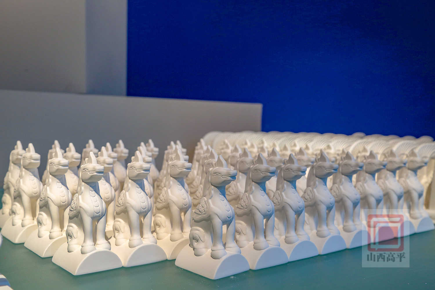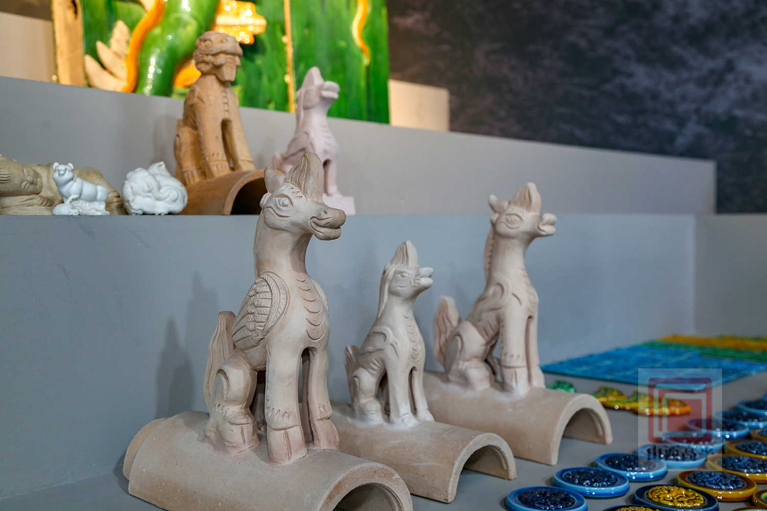 天马是中国古建五脊六兽之一,解兴明团队参照各个时期古建中天马造型进行样式设计,在保留传统神韵的基础上,线条更为流畅简约,符合现代审美与家居陈设需求。在色彩方面,突破古建琉璃以黄、绿为主的单色限制,尝试多种釉色搭配,通过精准控温烧制,使成品色泽饱满且富有层次。