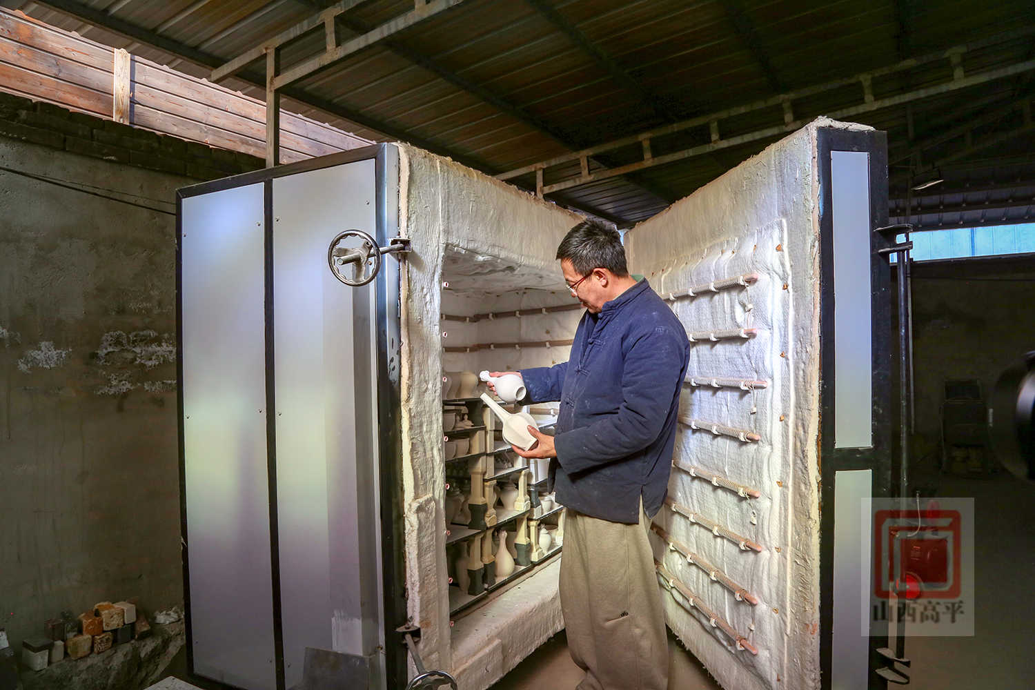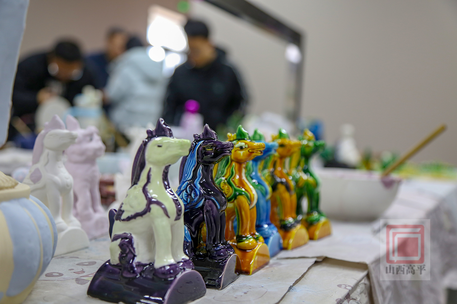 来到解兴明的工作室,工作人员正在赶制新一批琉璃天马订单。大家调配好釉料之后,为成型的素坯细致上釉,再将一件件坯体送入窑中烧制。工作台上,已烧制完成的天马摆件形态矫健、釉色明润,在光线下流转着晶莹光泽。