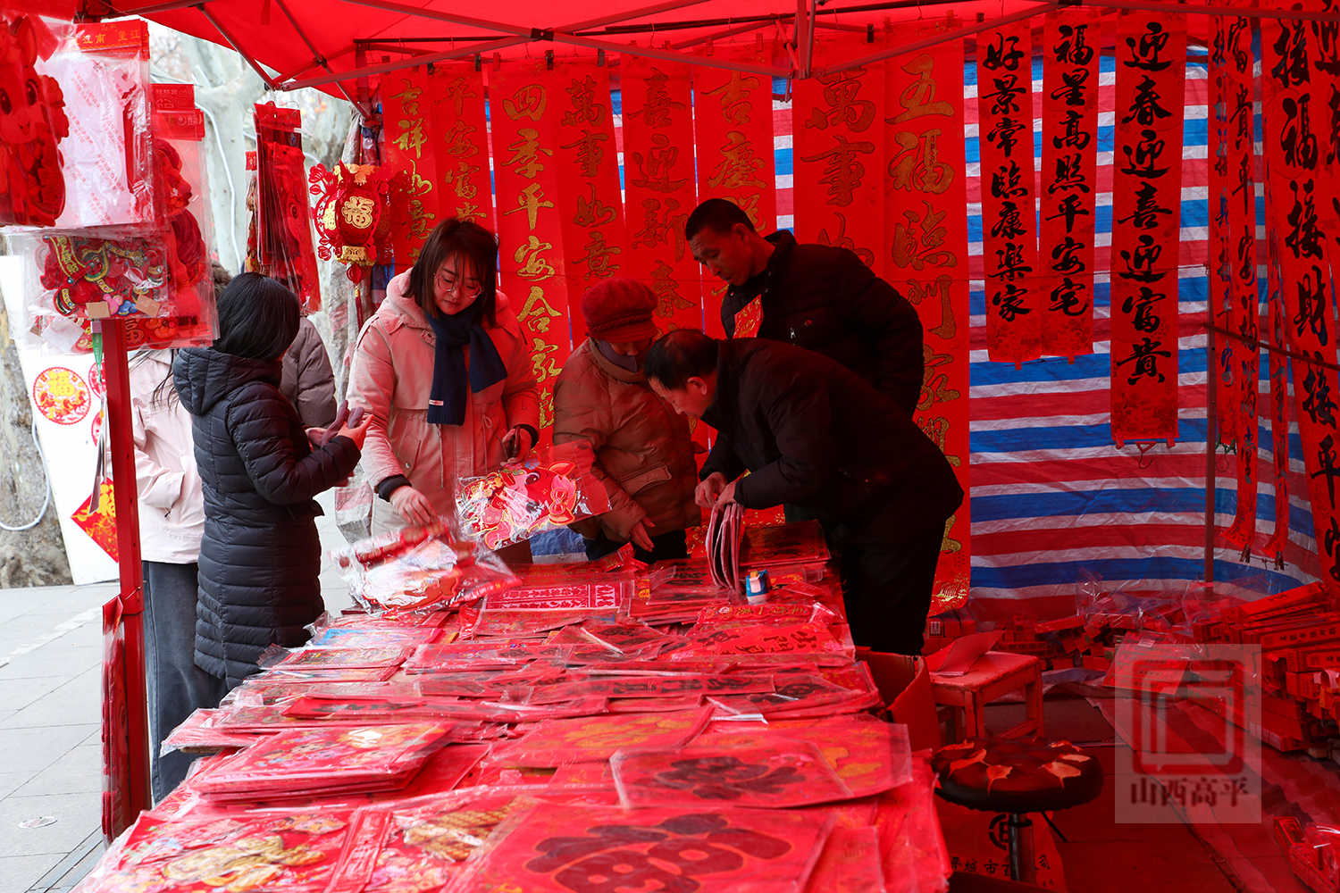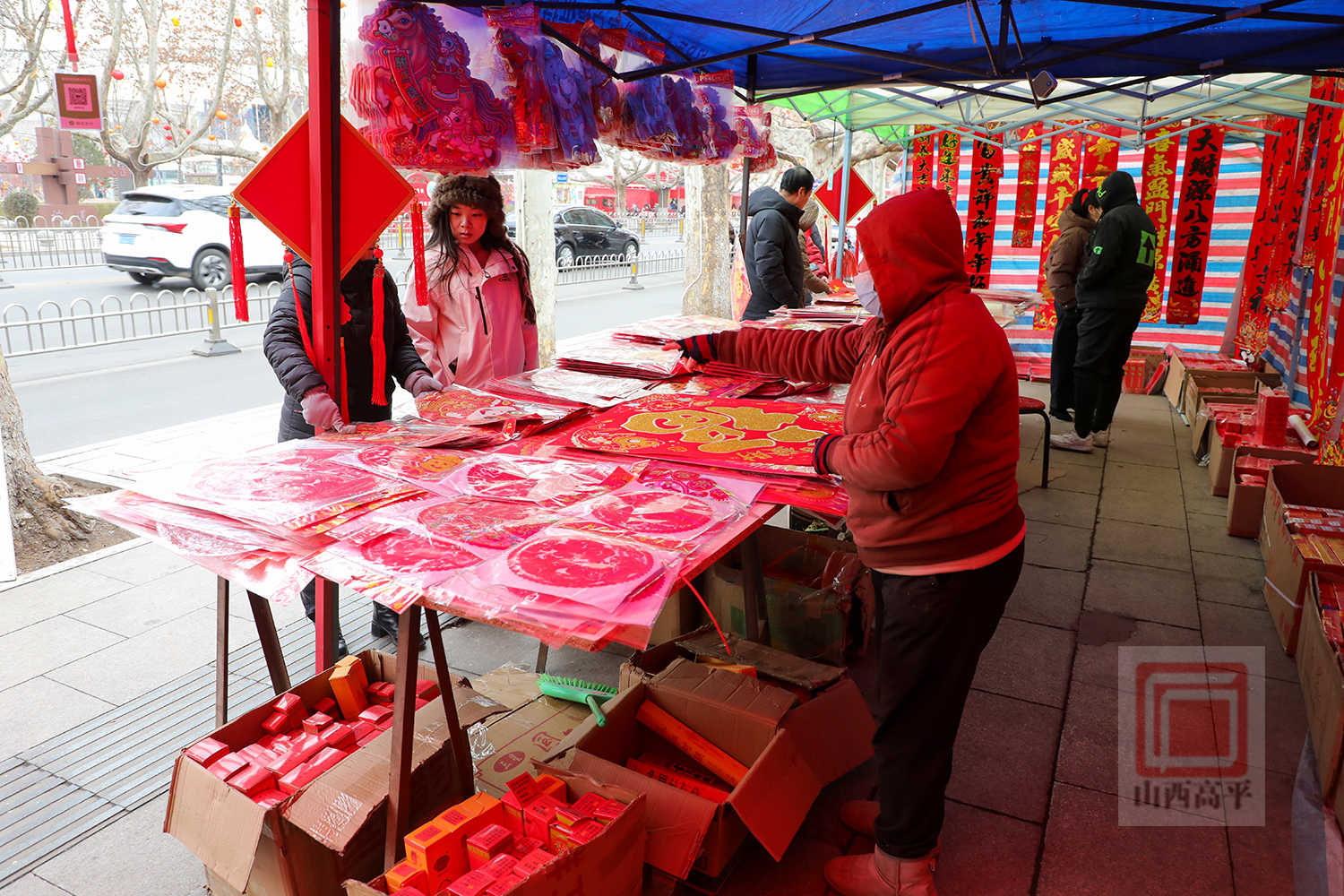 摊主杜俊芳一边整理着对联,一边介绍道:“春联、窗花、中国结这些都是过年的必备年货,大家图个喜庆吉祥,我的生意也格外红火。”
